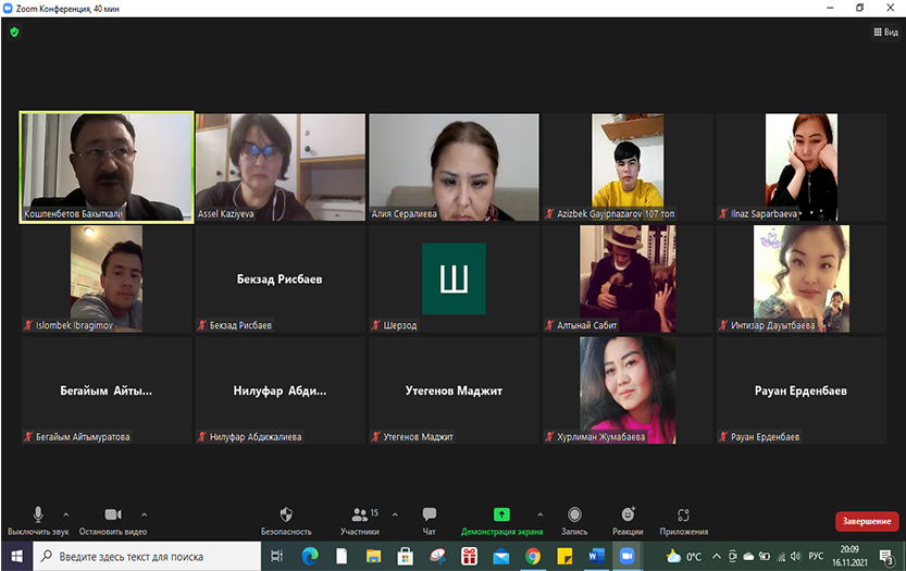 Кездесуде директордың оқу ісі жөніндегі орынбасары Д.Б. Асымова сөз сөйлеп, білім алушыларды Қазақстан Республикасынан тыс жерлерде жүзеге асырылатын барлық білім беру бағдарламалары бойынша шетелдік студенттер үшін дәріс, семинар сабақтары Zoom, Teams платформасында on-line форматында өткізілетіні туралы хабардар етті. Оқу сабақтарының барлық түрлері оқу сабақтарының кестесіне сәйкес жүргізіледі. Директордың тәрбие ісі жөніндегі орынбасары Н.Б. Манапбаев ол шетелдік студенттер тарих және құқық институтында өткізілетін барлық мәдени, қоғамдық, сауықтыру және басқа да іс-шараларға қатысуға құқылы екенін айтты. «Құқықтану» кафедрасының меңгерушісі Б.М. Кошпенбетов студенттерді мемлекеттік қызмет және мемлекеттік басқару мәселелері бойынша теориялық және қолданбалы ғылыми және педагогикалық зерттеулердің көшбасшысы болып табылатынын хабардар етті және «Құқықтану» кафедрасы өткізетін ғылыми үйірмелерге, студенттік ғылыми конференцияларға, дөңгелек үстелдерге және басқа да іс-шараларға қатысуды ұсынды. Топ кураторлары Казиева А.Н. және Сералиева А.М. академиялық адалдықты ұйымдастыру және қамтамасыз ету бойынша қызмет регламенттелетін «Академиялық адалдық» кодексімен және ҚазҰПУ-дың Әдеп кодексімен таныстырылды. Абай университеті құрылғаннан бері қалыптасқан жалпы танылған адамгершілік құндылықтарды, сондай-ақ дәстүрлер мен мінез-құлық стандарттарын сақтау бойынша барлық студенттер белсенді болып, өздерін қызықтырған тақырыптарға сұрақтар қойды.