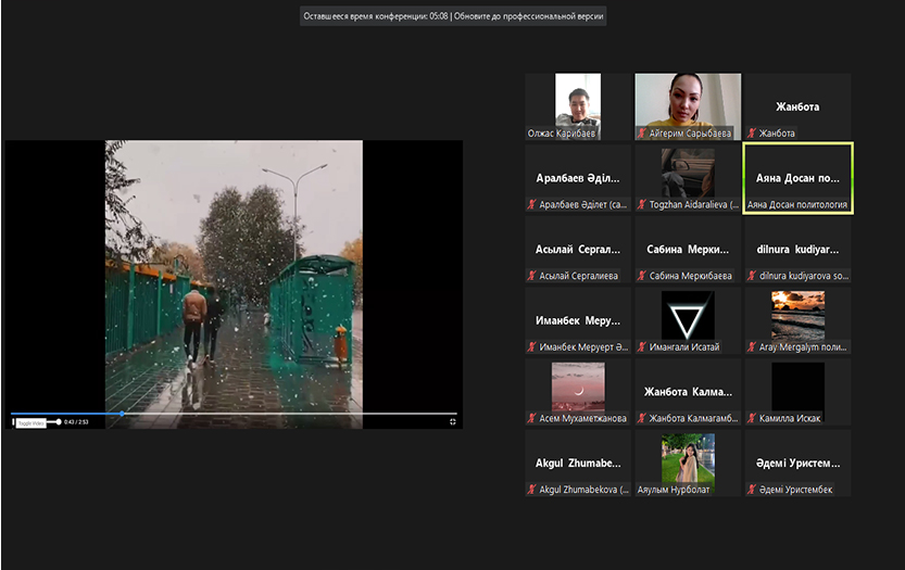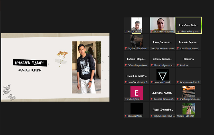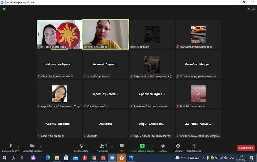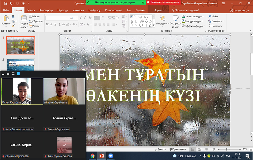 2021 жылдың 13 қарашасында Тарих және құқық институты саясаттану және әлеуметтік-философиялық пәндер кафедрасының эдвайзер-оқытушысы Сарыбаева Айгерімнің ұйымдастыруымен 1 курс «Әлеуметтану», «Саясаттану» мамандықтарының арасында онлайн форматта «Мен тұратын өлкенің күзі» тақырыбында танымдық-тәрбие сағаты өткізілді. Танымдық-тәрбие сағатына кафедра оқытушылары Олжас Карибаев, Жаныл Мадалиева мен Әсел Батырханова қатысып, екі топтың өнерлерін тамашалады.