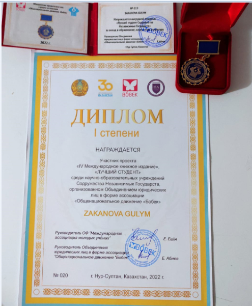 Тарих және құқық институтының саясаттану және әлеуметтік-философиялық пәндер кафедрасы «Дінтану және саясат» мамандығының 3 курс студенті Заканова Гүлім ғылым және мәдениетке қосқан үлесі үшін «Тәуелсіз Мемлекеттер Достастығының үздік студенті» медальмен және І дәрежелі дипломмен марапатталды.