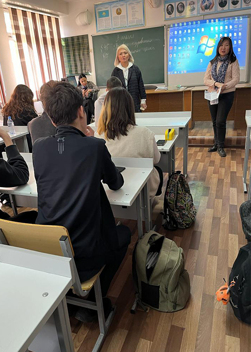Кездесуге 11-ші сынып оқушылары (2-сынып), сынып жетекшісі, мектептің тәрбие ісінің меңгерушісі қатысты. Кездесу барысында оқушыларға 95 жылдық тарихы бар Абай атындағы ҚазҰПУ туралы ақпарат берілді. Сонымен қатар биылдан бастап Тарих және құқық институтының «Философия» және «Дінтану» жаңа мамандықтарына құжат қабылдау жүргізіліп жатқаны атап өтіліп, «Мәдениеттану», «Әлеуметтану», «Саясаттану» мамандықтары бойынша да ақпарат берілді. Жиналған қауымның назары Абай атындағы ҚазҰПУ-дың педагогикалық дәстүрлер мен инновациялар университеті екендігіне аударылды.