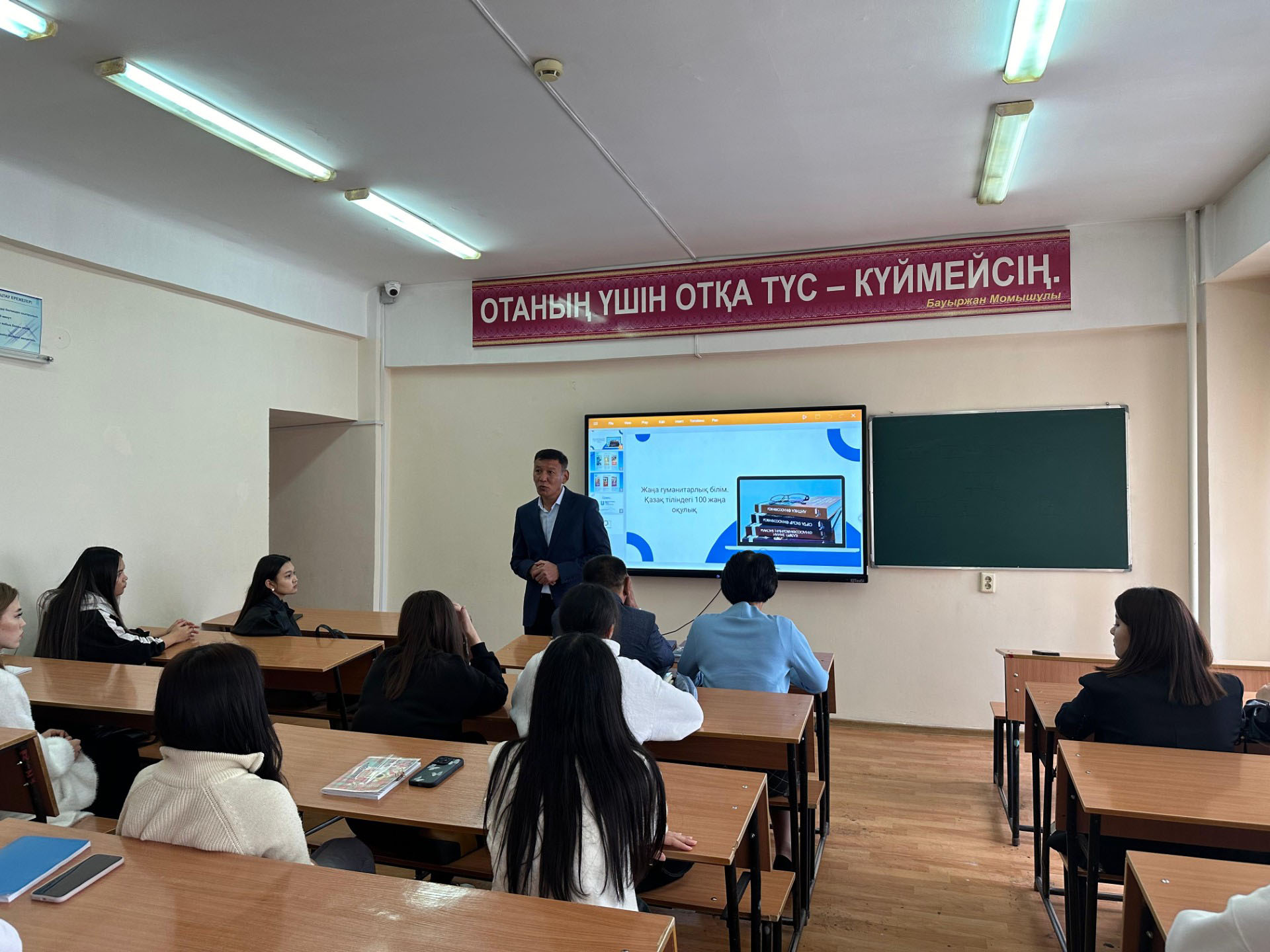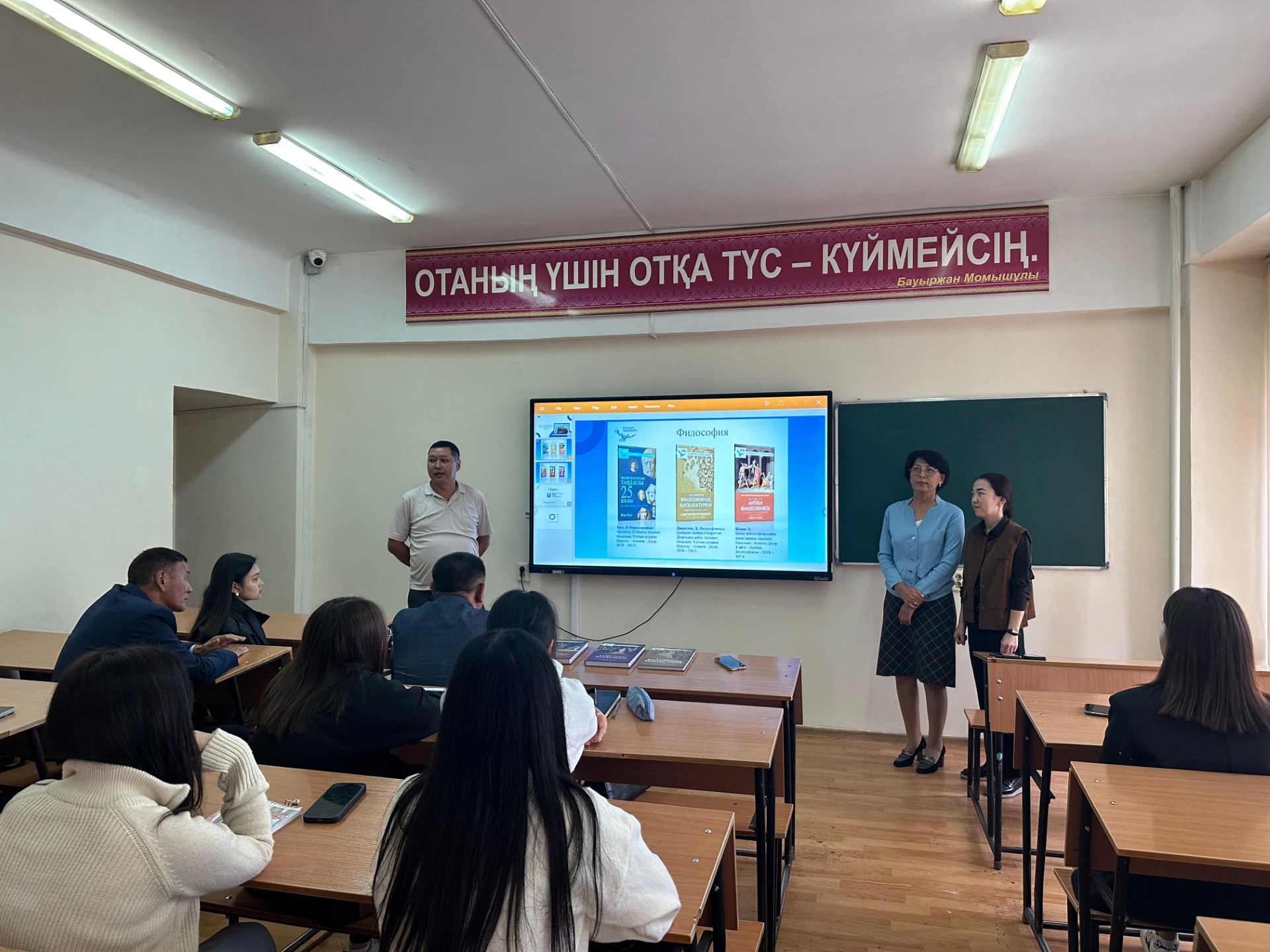 Кездесу барысында «Жаңа гуманитарлық білім. Қазақ тіліндегі 100 жаңа оқулық» жобасы бойынша аударылған оқулықтар туралы презентация мен видео көрсетілді. Студенттер жаңа оқулықтармен қызыға танысып, өз пікірлерін білдірді және ерекшеліктеріне тоқталып маңызды тұстарын көрсетіп берді.