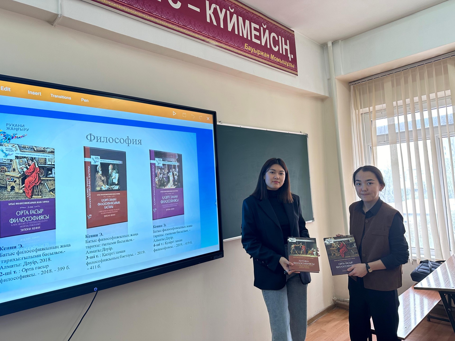«Жаңа гуманитарлық білім. Қазақ тіліндегі 100 жаңа оқулық» Абай атындағы ҚазҰПУ Тарих және құқық факультеті саясаттану және әлеуметтік-философиялық пәндер кафедрасында «Жаңа гуманитарлық білім. Қазақ тіліндегі 100 жаңа оқулық» аясында шығарылған философиялық кітаптарды таныстыру рәсімі өтті. Іс-шараға философия мамандығының 1 курс студенттері мен 2 курс магистранттары қатысты. Шарада сөз сөйлеген аға оқытушы Бақыттыжамал Иманмолдаева және гуманитарлық ғылымдар магистрі Нуртаза Мухабаев философиялық ойдың даму тарихына айрықша үлес қосқан 15 ойшылдың шығармашылығы қарастырылған Дерек Джонстонның «Философияның қысқаша тарихы. Сократтан Дерридаға дейін» еңбегімен таныстырды.