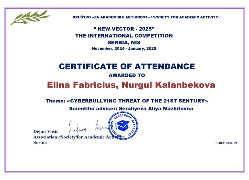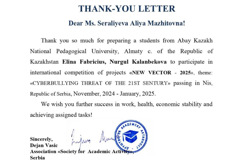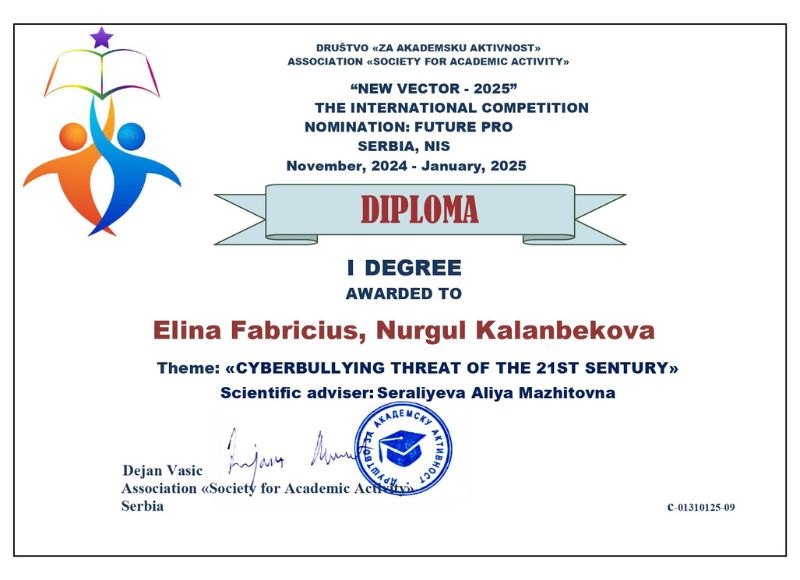 Aбай университетінің оқытушысы мен студенттері халықаралық байқаудан I дәрежелі дипломмен марапатталды Саясаттану және әлеуметтік-философиялық пәндер кафедрасы жанындағы «Қазақстан халқы Ассамблеясы» орталығының қызметкері заң ғылымдарының кандидаты, қауымдастырылған профессоры, (доцент) Сералиева Алия Мажитовна Сербия Республикасы, Ниш қаласында ұйымдастырылған «New Vector - 2025» атты халықаралық жоба байқауына өзінің 1 курс студенттері Элина Фабрициус, Нұргүл Қаланбековамен қатысып, I дәрежелі дипломмен марапатталды. Байқауға «21 ғасырдағы кибербуллинг қауіпі» атты тақырыпта жобамен қатысты. Жұмыстарыңызға табыс, алға қойған мақсаттарыңызға жетулеріңізге тілектеспіз!