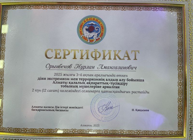 Діни экстремизм мен терроризмнің алдын алу бойынша семинар 2025 жылдың 3-4 ақпанында Абай атындағы ҚазҰПУ Тарих және құқық факультеті саясаттану және әлеуметтік-философиялық пәндер кафедрасының оқытушысы Орынбеков Нұрлан «діни экстремизм мен терроризмнің алдын алу бойынша Алматы қалалық ақпараттық-түсіндіру тобының мүшелеріне арналған» 2 күндік семинарына қатысты. Семинар барысында Алматы қаласы Діни істер басқармасының басшылары, ҚР Ұлттық қауіпсіздік комитетінің Терроризмге қарсы дайындық орталығының спикерлері және еліміздің белгілі қайраткерлері аталған іс-шараға байланысты маңызды ақпараттармен бөлісті. Еліміздің тыныштығын сақтау мақсатында ұйымдастырылған семинар жоғары деңгейде өтті.