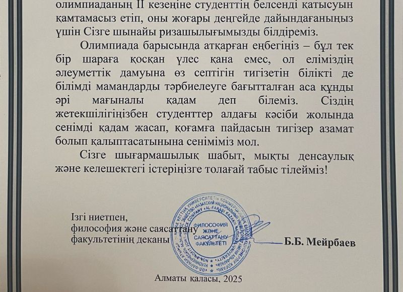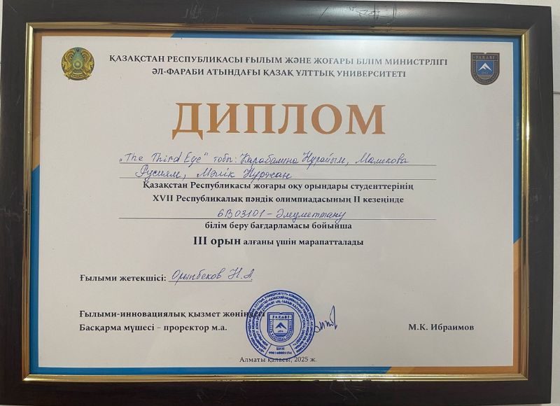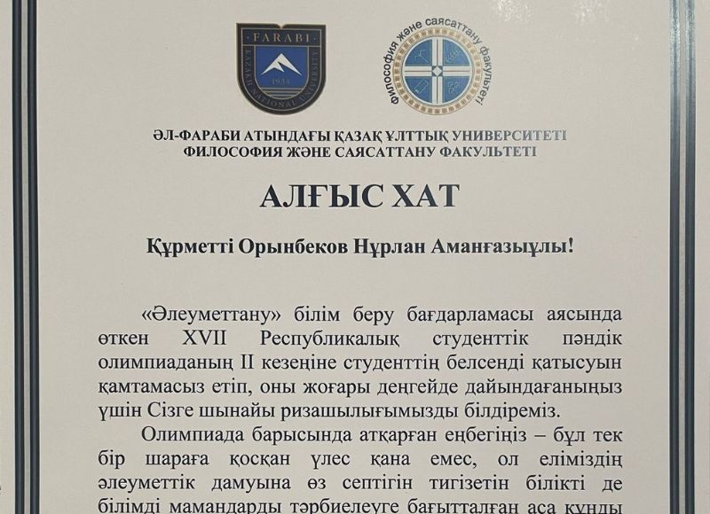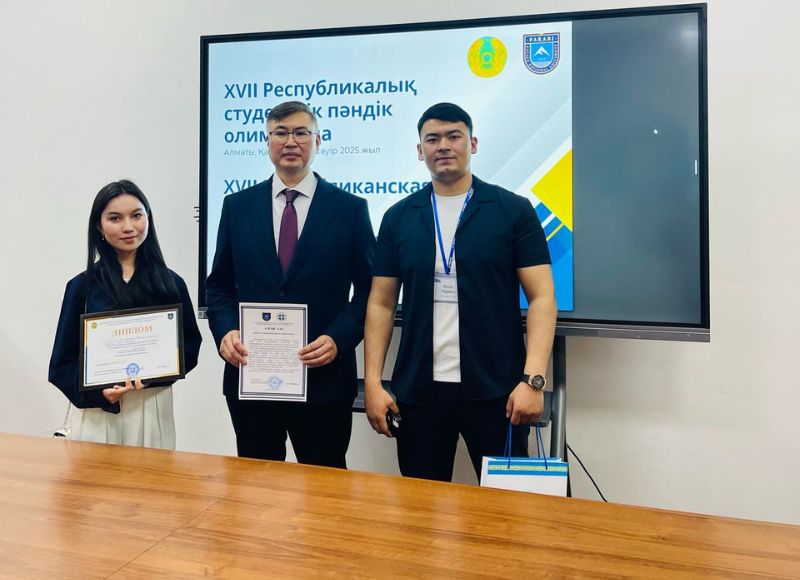 Абай университетінің студенттері Республикалық пәндік олимпиадада жүлделі орынға ие болды 2025 жылдың 22 сәуірінде Абай атындағы ҚазҰПУ Тарих және құқық факультеті саясаттану және әлеуметтік-философиялық пәндер кафедрасы «6B03103 - Әлеуметтану» мамандығының 3 курс студенттері - Нұрайым Карабалина, Русиям Маликова және Нұржан Мәлік XVII Республикалық студенттік пәндік олимпиадада жүлделі III орынды жеңіп алып, дипломмен марапатталды.