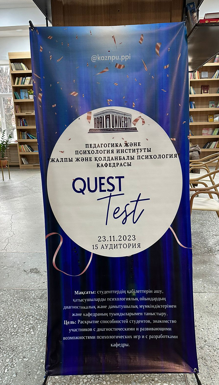 2023 жылдың 23 қарашасында Абай атындағы ҚазҰПУ Педагогика және психология институтының жалпы және қолданбалы психология кафедрасының ұйымдастыруымен 1-курс студенттеріне арналған «QUEST-TEST» ойыны өткізілді. Бұл ойынның бастамашылары ретінде кафедраның аға оқытушылары Тусубекова Кунслу, Садыкова Анель, Ингайбекова Толқын, сондай-ақ, «6В03111-Практик психологтарды даярлау» мамандығының бітіруші курс студенттері Белгібаев Батыр, Сағынғали Айым, Нұржанқызы Сая, Өскенбаев Тимур, Сисембина Далида, Тимошук Маргарита, Мыңбай Әлішер белсенді ұйымдастырушылар болды.