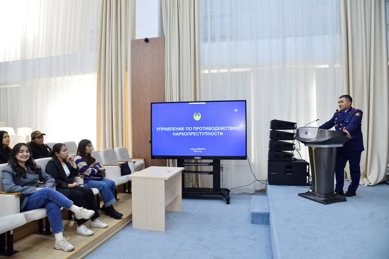 Полиция департаментінің аға жедел уәкілі студенттермен бірге нашақорлыққа қарсы күрес шараларын, есірткі заттарын өткізу мен таратқаны үшін жазаны, нашақорлық мәселелері бойынша деректер мен статистиканы талқылады.