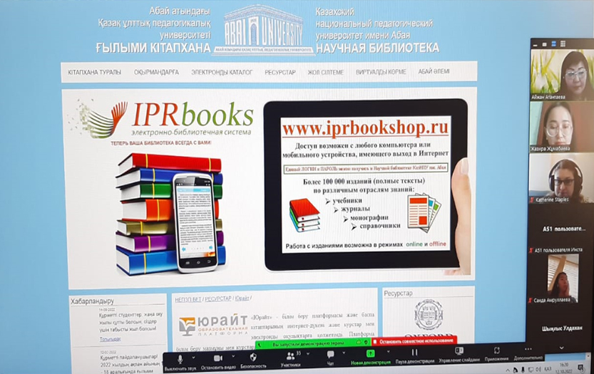 18.10.2022 Кітапхана ресурстары жас ғалымдардың ғылыми әлеуетін дамытуға бағытталған 2022 жылдың 14 қазан күні Абай атындағы Қазақ ұлттық педагогикалық университетінде «Жас ғалымдардың ғылыми әлеуетін дамытуға бағатталған кітапхананың деректік қорлары» тақырыбында вебинар болып өтті.