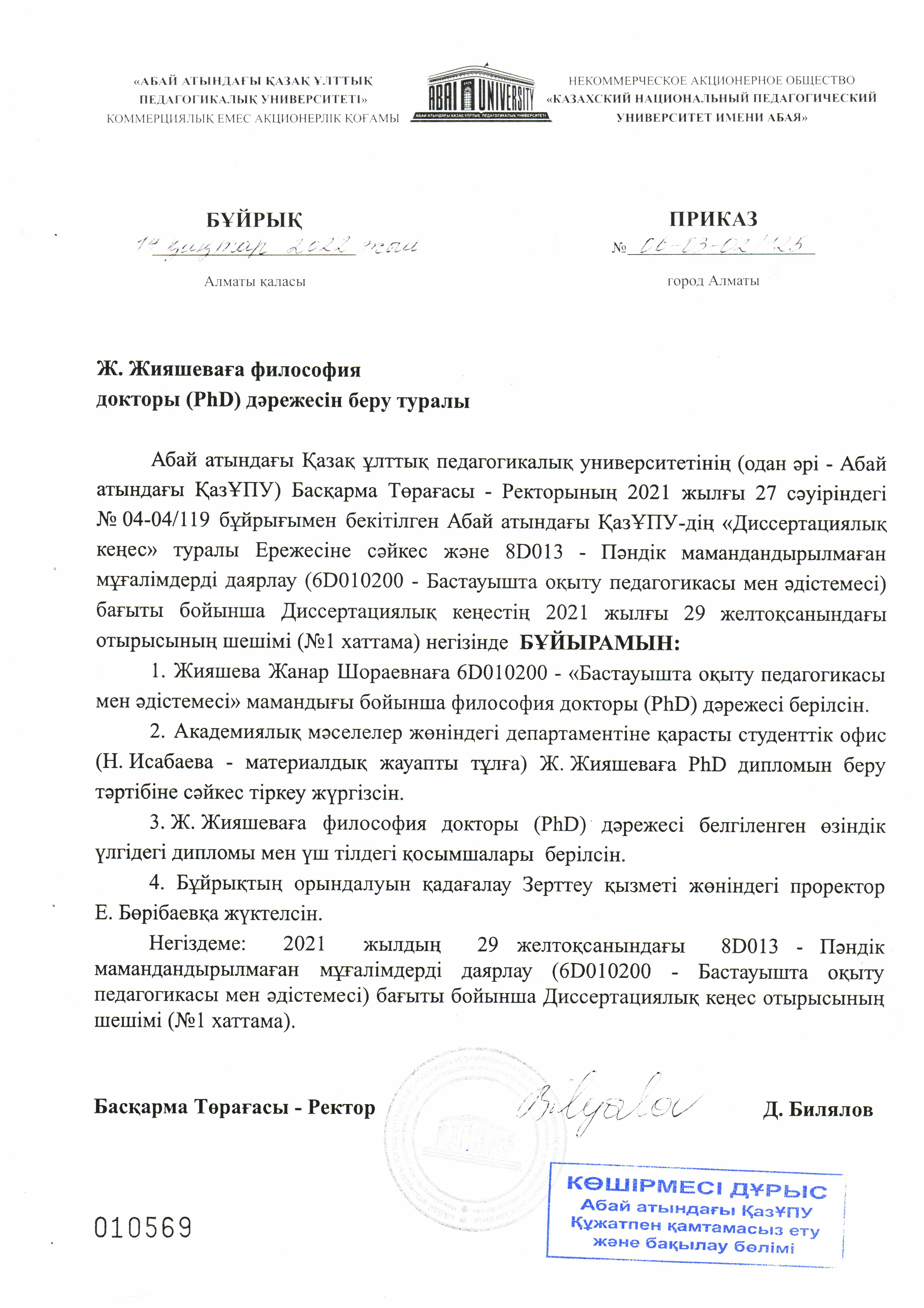 Философия докторы (PhD) дәрежесін беру туралы бұйрық