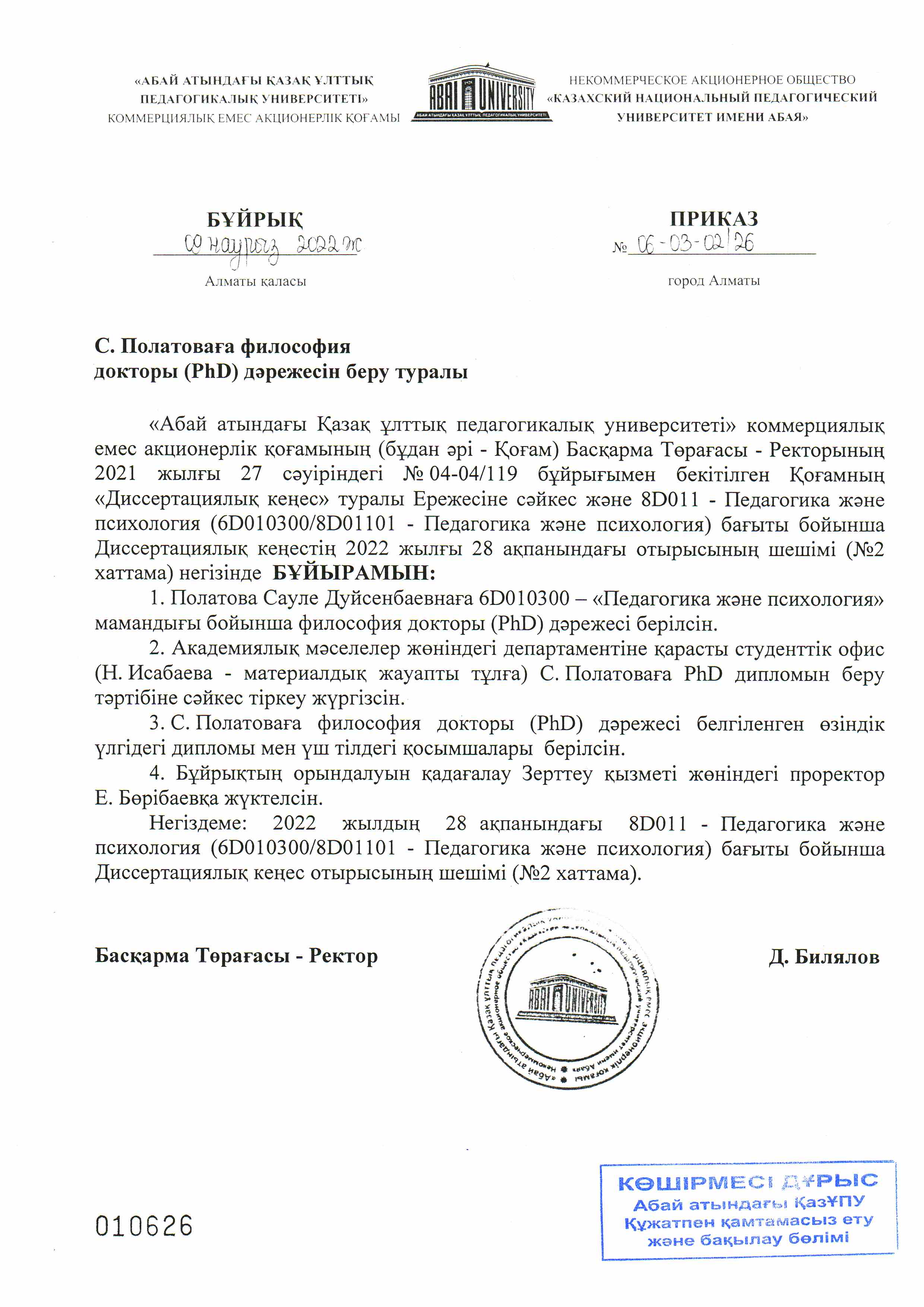 Диссертацияны қорғау барысында түсірілген бейне жазба Философия докторы (PhD) дәрежесін беру туралы бұйрық