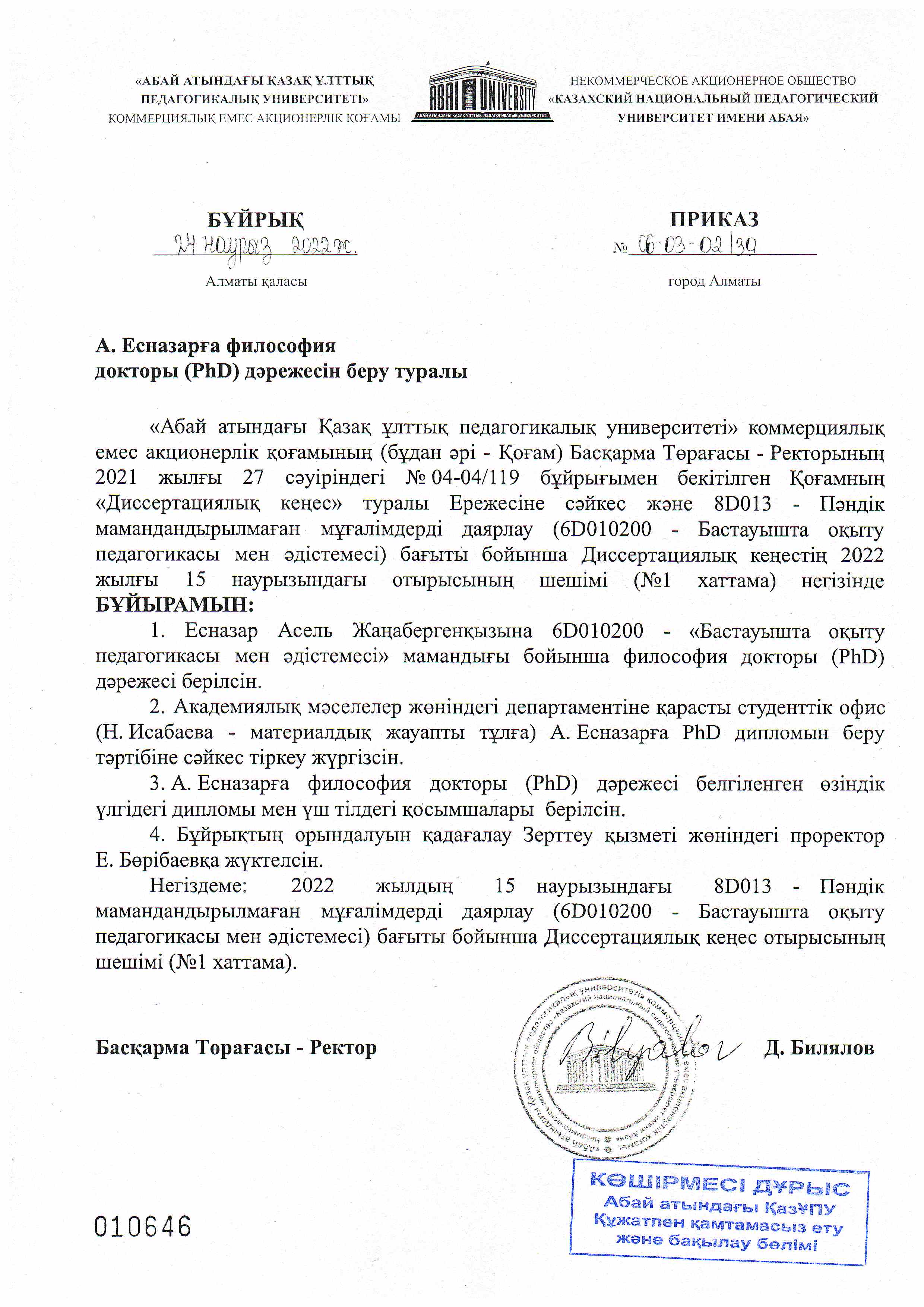 Философия докторы (PhD) дәрежесін беру туралы бұйрық