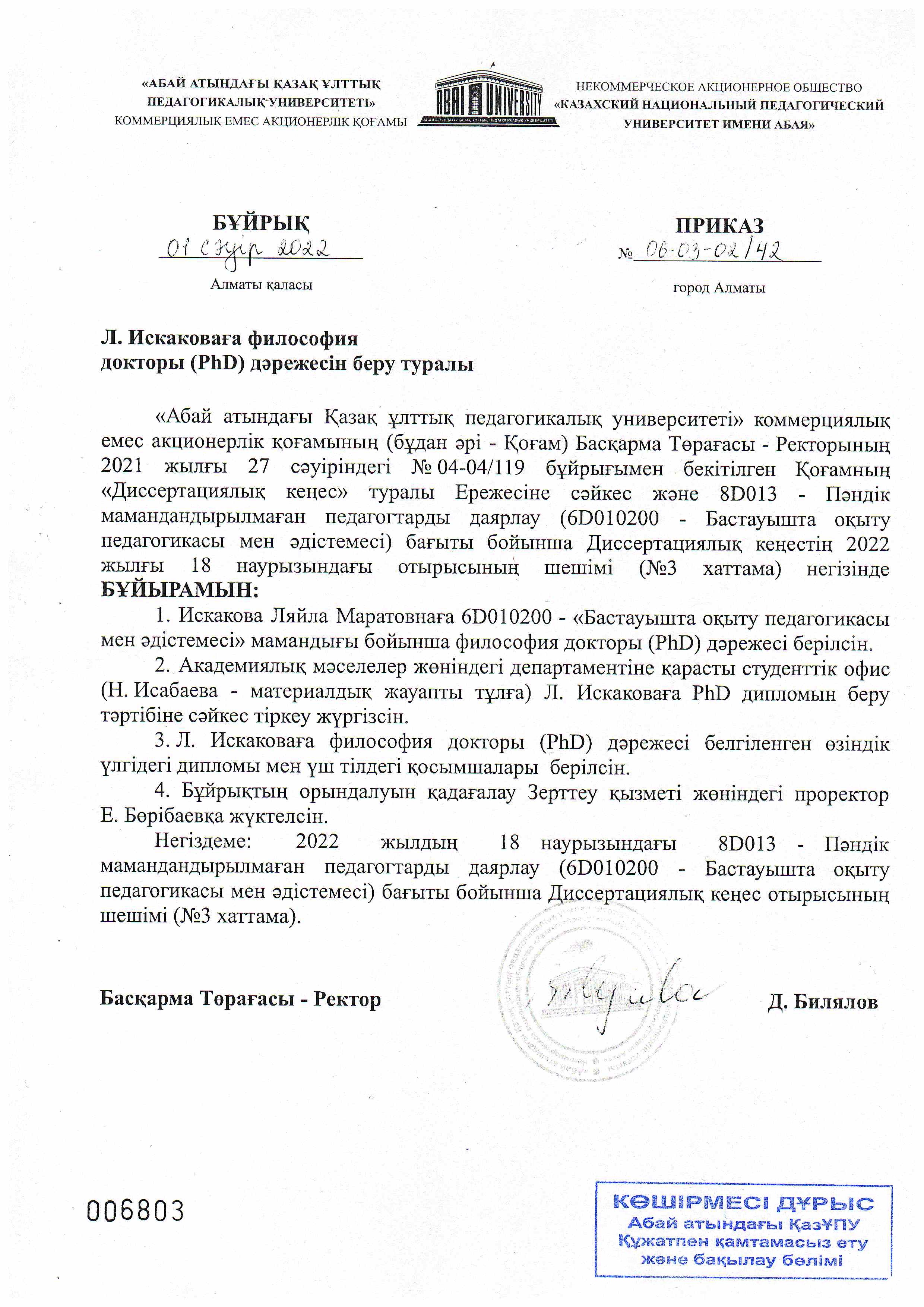 Абай атындағы Қазақ ұлттық педагогикалық университетінде 8D013 - Пәндік мамандандырылмаған педагогтерді даярлау (6D010200 - Бастауышта оқыту педагогикасы мен әдістемесі) бағыты бойынша философия докторы (PhD), бейіні бойынша доктор дәрежелерін беру үшін құрылған Диссертациялық кеңесте «6D010200 - Бастауышта оқыту педагогикасы мен әдістемесі» мамандығы бойынша ізденуші Искакова Ляйла Маратовнаның «Сыни ойлау негізінде болашақ бастауыш сынып мұғалімдерінің зияткерлігін дамыту» тақырыбындағы диссертациялық жұмысы қорғалады.