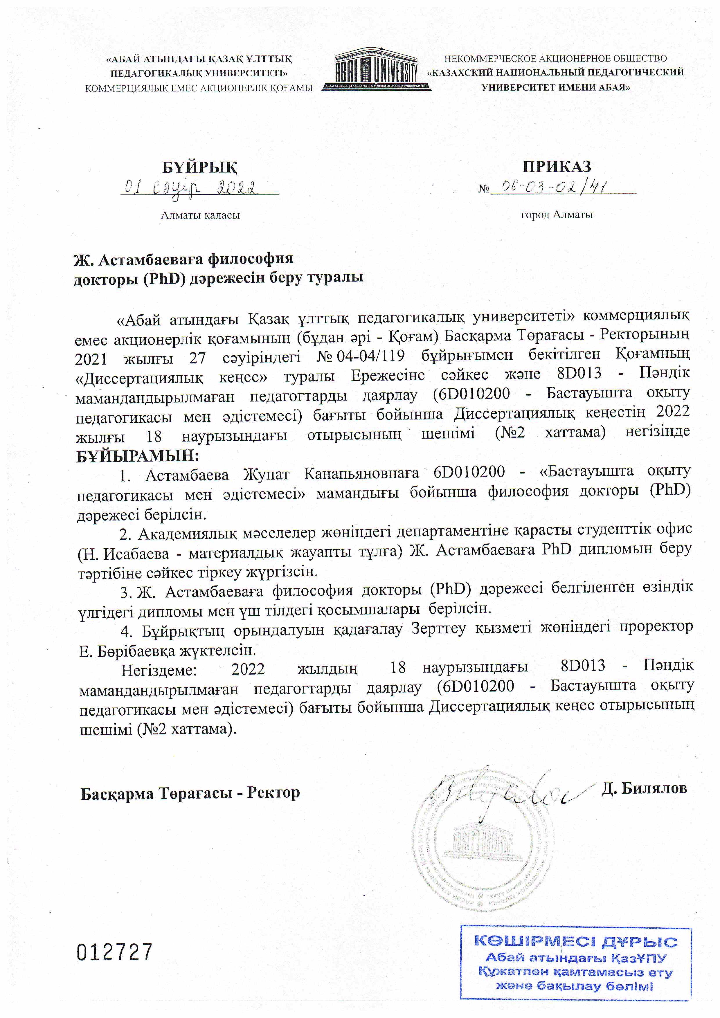 Абай атындағы Қазақ ұлттық педагогикалық университетінде 8D013 - Пәндік мамандандырылмаған педагогтерді даярлау (6D010200 - Бастауышта оқыту педагогикасы мен әдістемесі) бағыты бойынша философия докторы (PhD), бейіні бойынша доктор дәрежелерін беру үшін құрылған Диссертациялық кеңесте «6D010200 - Бастауышта оқыту педагогикасы мен әдістемесі» мамандығы бойынша ізденуші Астамбаева Жупат Канапьяновнаның «Алгоритмдерді оқыту барысында болашақ бастауыш сынып мұғалімдерінің әдістемелік-математикалық сауаттылығын дамыту» тақырыбындағы диссертациялық жұмысы қорғалады.