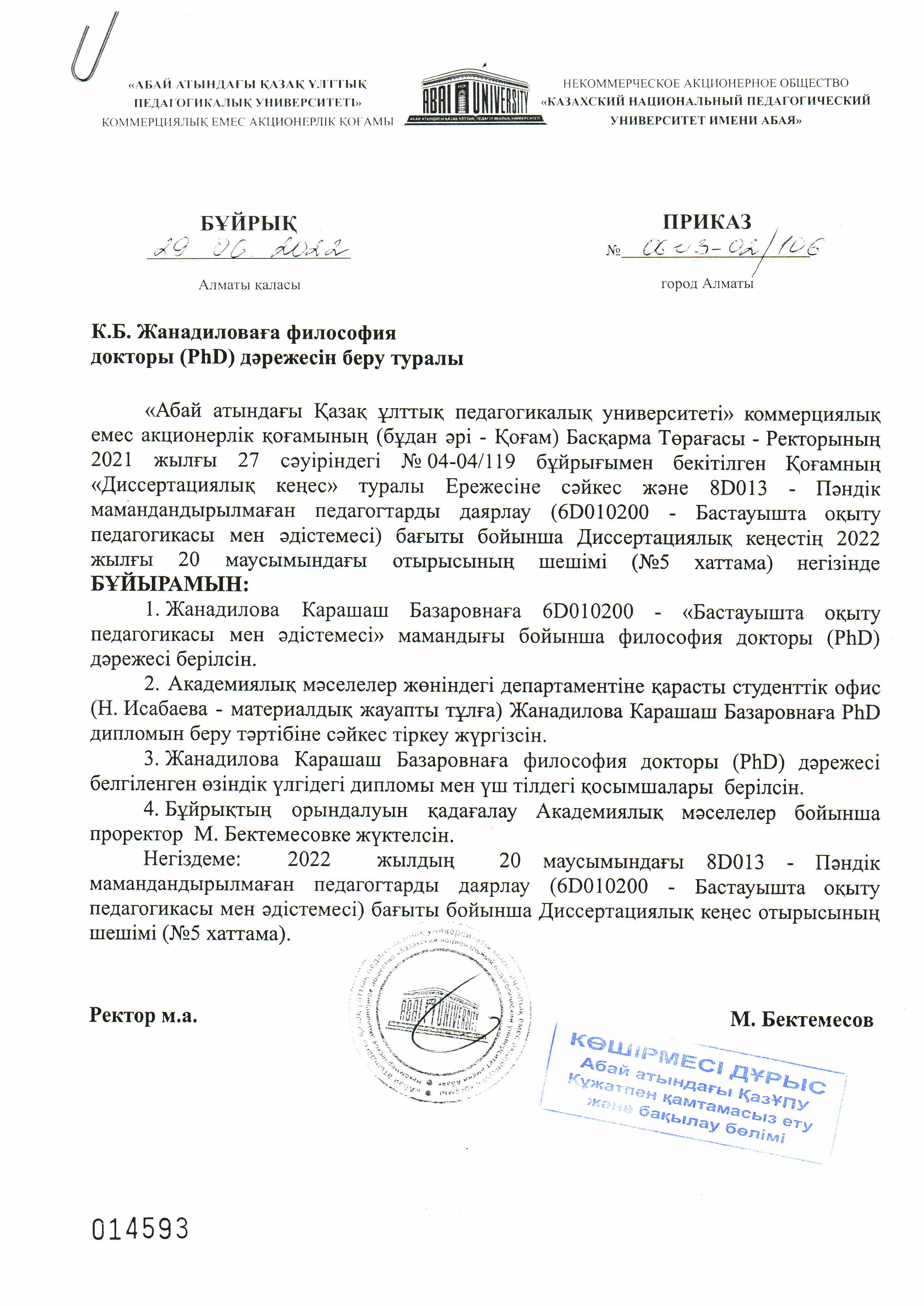 Философия докторы (PhD) дәрежесін беру туралы бұйрық