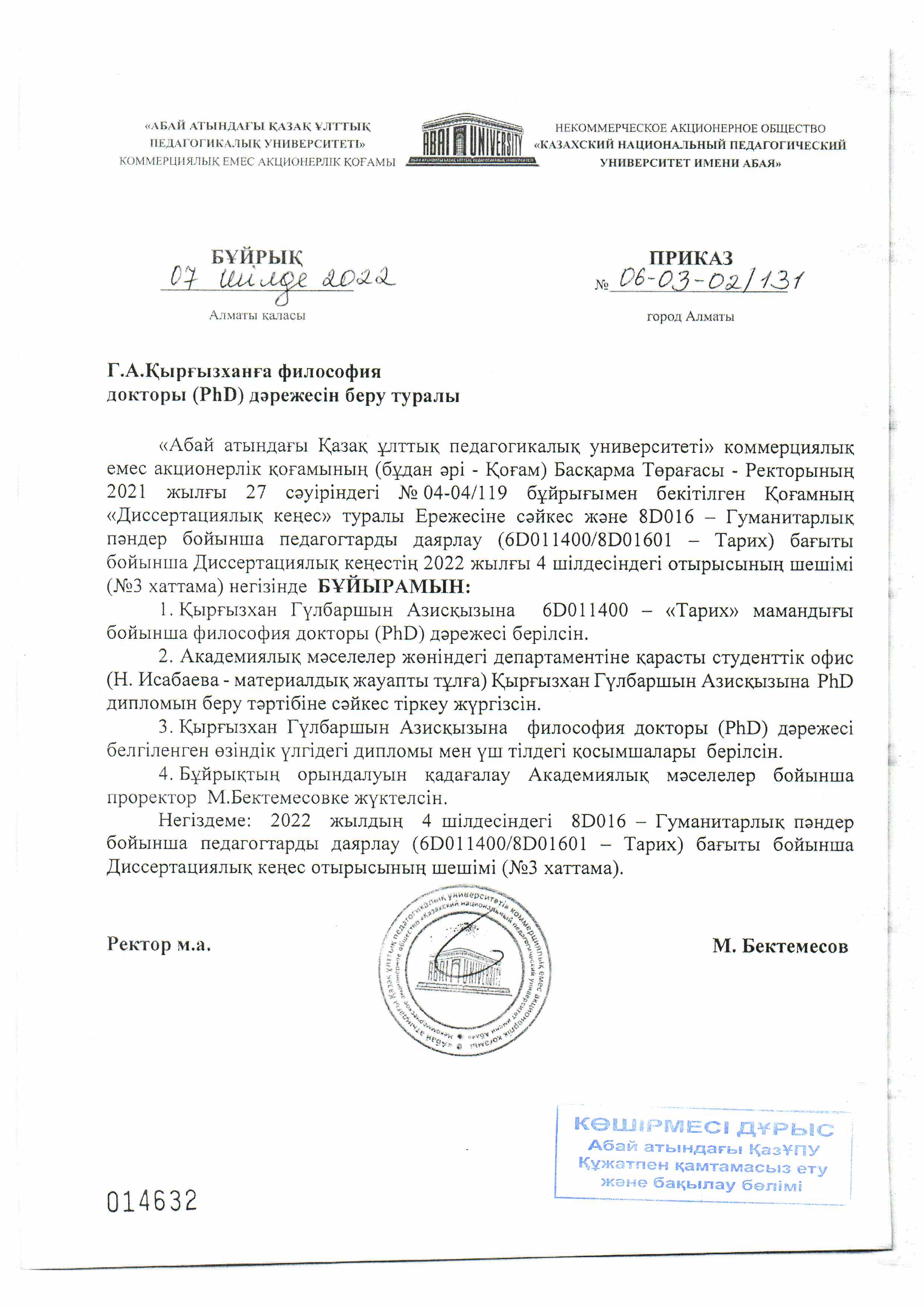 Диссертациялық кеңестің уақытша мүшелері Диссертацияны қорғау барысында түсірілген бейне жазба Философия докторы (PhD) дәрежесін беру туралы бұйрық