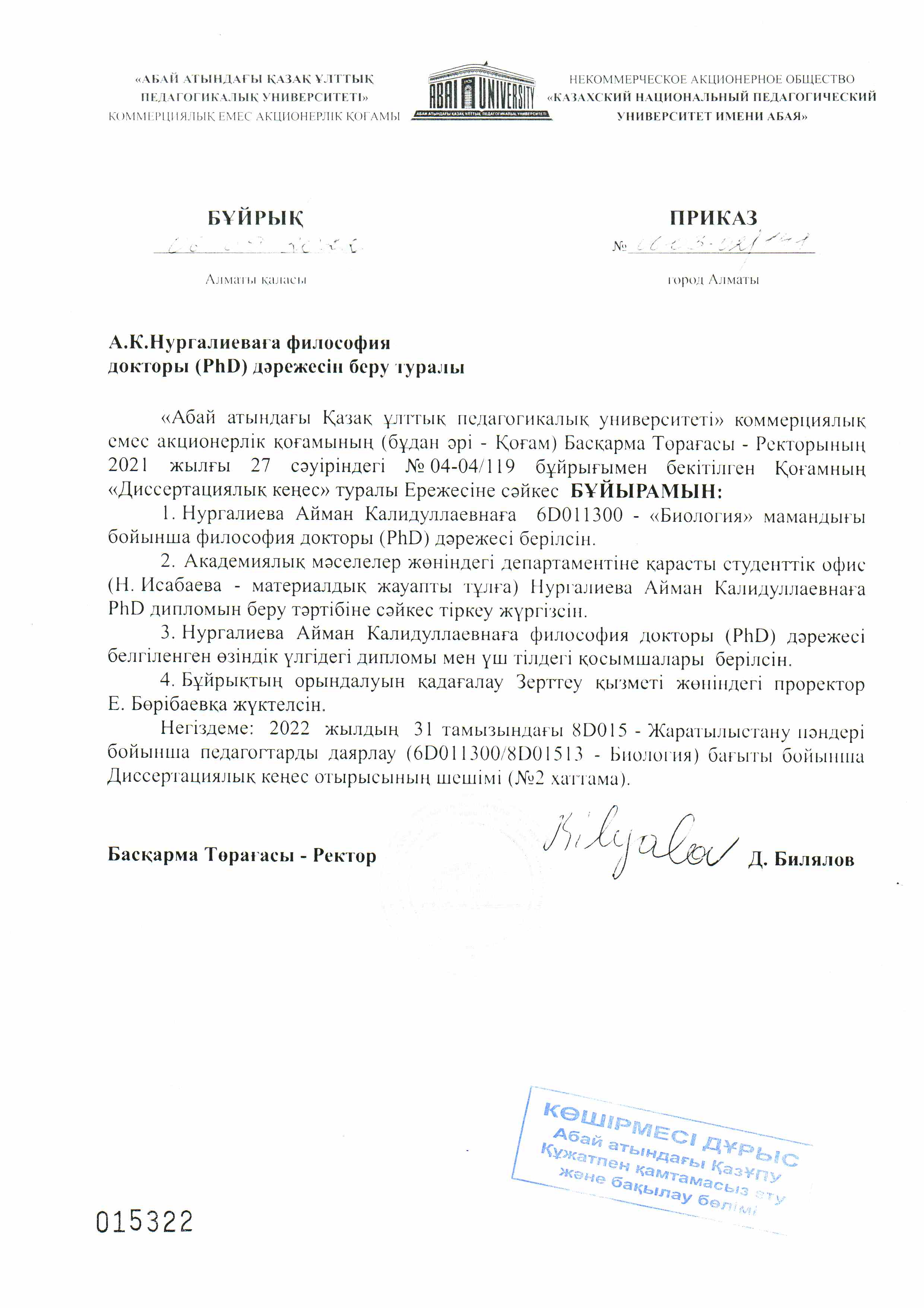 Философия докторы (PhD) дәрежесін беру туралы бұйрық Кері оралу |