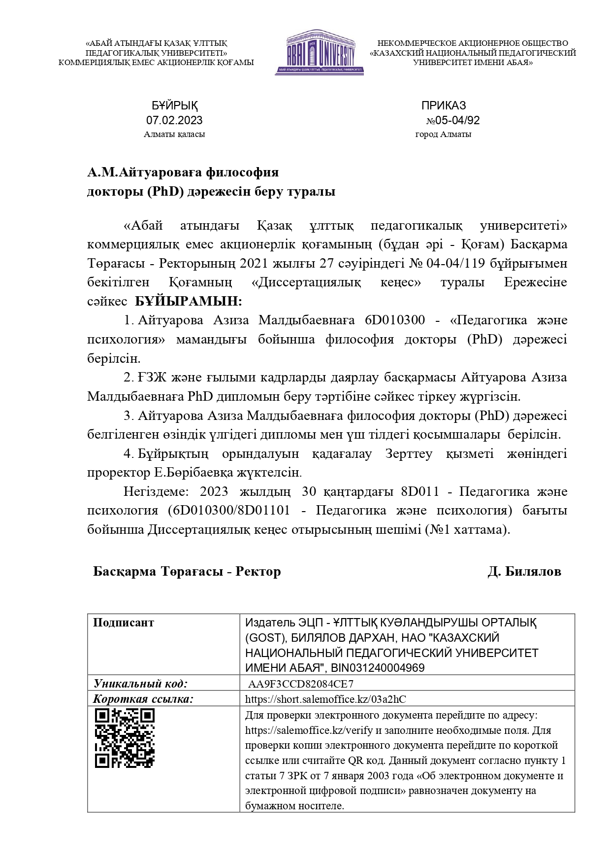 Диссертацияны қорғау 2023 жылы 31 қаңтар сағат 14.00-де Абай атындағы Қазақ ұлттық педагогикалық университетінде өтеді.