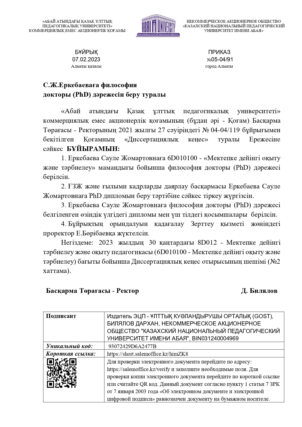 Абай атындағы Қазақ ұлттық педагогикалық университетінде «8D012-Мектепке дейінгі тәрбиелеу және оқыту педагогикасы» (6D010100 - Мектепке дейінгі оқыту және тәрбиелеу) бағыты бойынша философия докторы (РhD) дәрежесін беру үшін құрылған Диссертациялық кеңесте «6D010100-Мектепке дейінгі оқыту және тәрбиелеу» мамандығы бойынша ізденуші Еркебаева Сауле Жомартовнаның «Жаңартылған білім мазмұны жағдайында мектепке дейінгі ересек жастағы балалардың коммуникативтік дағдысын дамыту» тақырыбындағы диссертациялық жұмысы қорғалады.