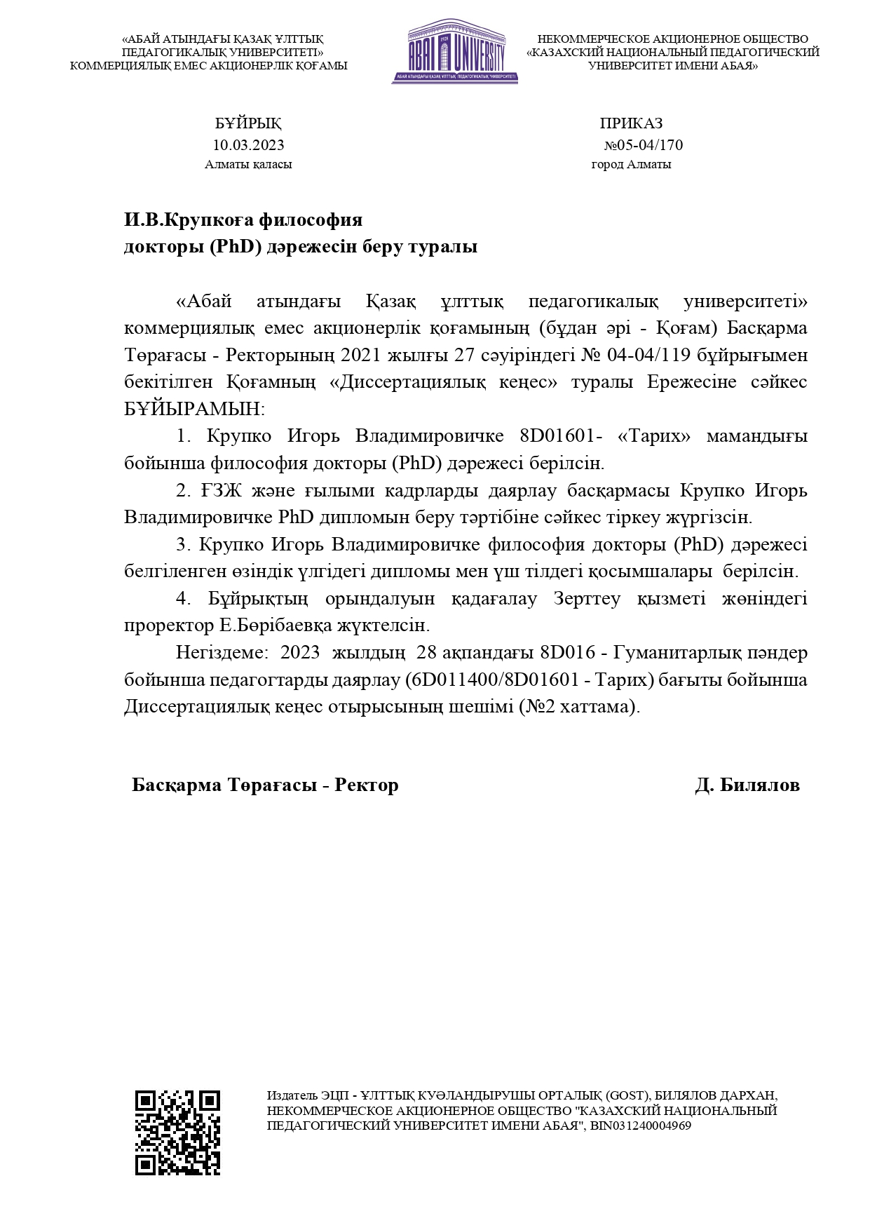 Абай атындағы Қазақ ұлттық педагогикалық университетінде «8D016- Гуманитарлық пәндер педагогтерін даярлау (6D011400/8D01601- Тарих)» бағыты бойынша философия докторы (РhD) дәрежесін беру үшін құрылған Диссертациялық кеңесте «8D01601-Тарих» білім беру бағдарламасының докторанты Крупко Игорь Владимировичтің «Қазақстандық қоғамының тарихи жады туралы әңгімелердің семиозисы (1991-2021 ж.ж.)» тақырыбындағы диссертациялық жұмысы қорғалады.