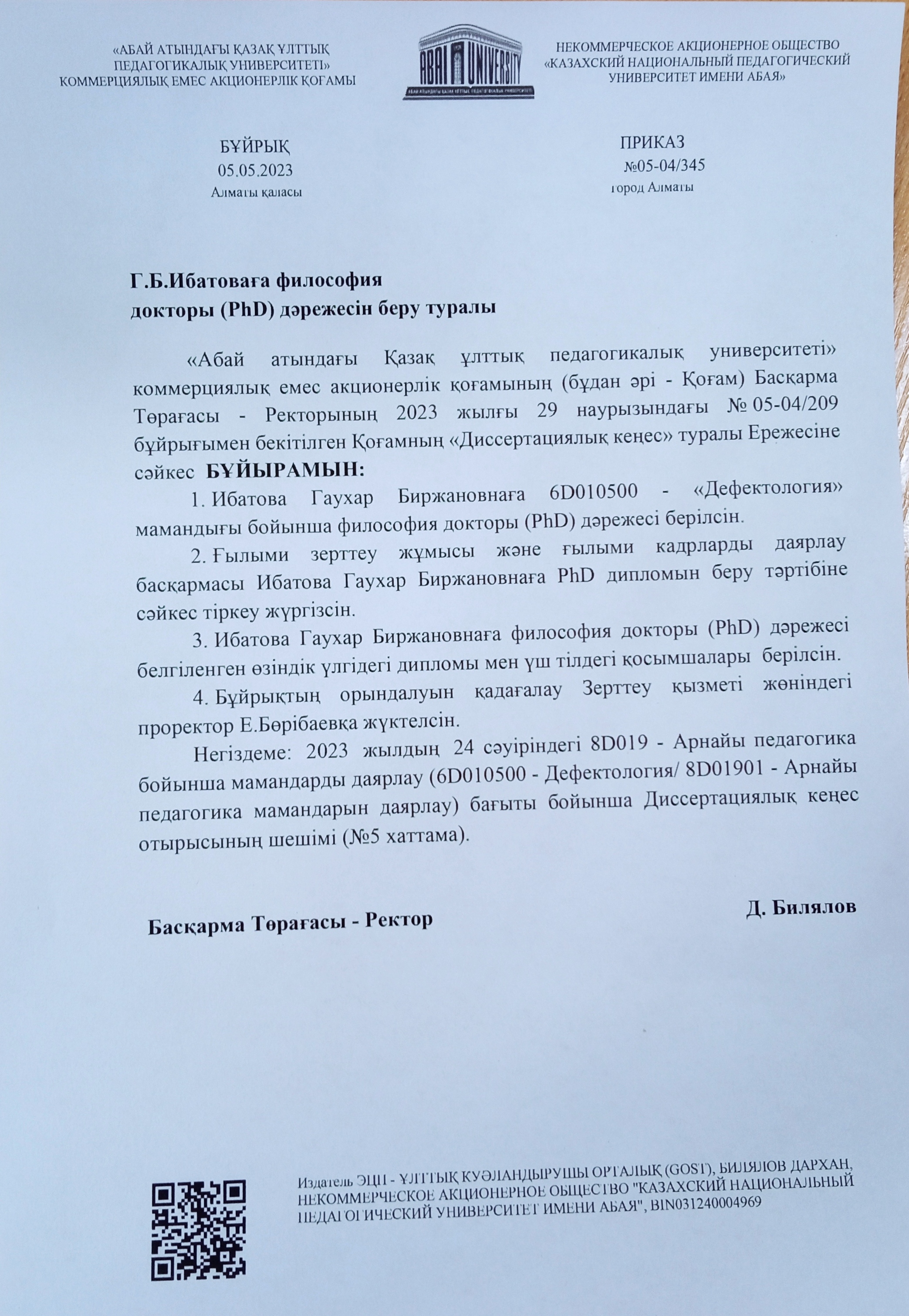 Абай атындағы Қазақ ұлттық педагогикалық университетінде «8D019 - Арнайы педагогика бойынша мамандарды даярлау» («6D010500 - Дефектология»/ «8D01901 - Арнайы педагогика мамандарын даярлау») бағыты бойынша философия докторы (РhD) дәрежесін беру үшін құрылған Диссертациялық кеңесте «6D010500-Дефектология» мамандығы бойынша ізденуші Ибатова Гаухар Биржановнаның «Сөйлеу тілі жалпы дамымаған мектеп жасына дейінгі балалардың сөзжасам дағдыларын дамыту» тақырыбындағы диссертациялық жұмысы қорғалады.