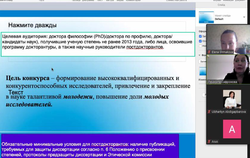 2021 жылдың 23 желтоқсанында Ғылым департаментінің бастамасымен 2022-2024 жылдарға арналған «Жас ғалым» жобасы бойынша жас ғалымдарды гранттық қаржыландыруға конкурстық құжаттама бойынша консультациялық вебинар өтті. Вебинар модераторы ретінде Ғылым департаментінің директоры У.М. Әбдіғапбарова іс-шараның басым міндеттеріне тоқталды, баяндамашы - профессор Л.В. Сафронова грантқа өтінімді дайындау бойынша маңызды ақпаратты атап өтті. Вебинар осы конкурстың мақсатты аудиториясы - философия докторлары (PhD), докторантураны игерген ізденушілер, сондай-ақ постдокторанттардың ғылыми кеңесшілері арасында үлкен қызығушылық тудырды.
