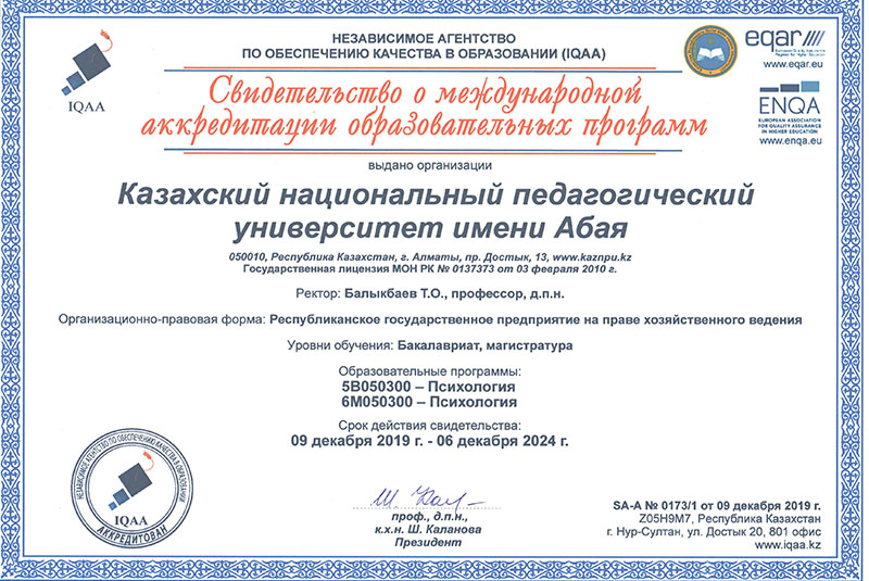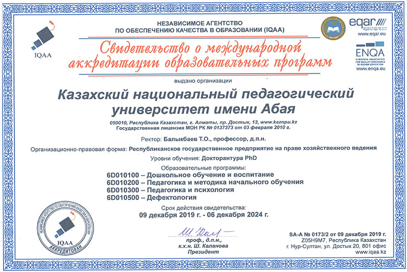Абай атындағы ҚазҰПУ 2019 жылы Білім беру сапасын қамтамасыздандыру тәуелсіз қазақстандық агенттігінен (IQAA) 5 жыл мерзімге бағдарламалық (мамандандырылған) аккредиттеуден сәтті өтті.