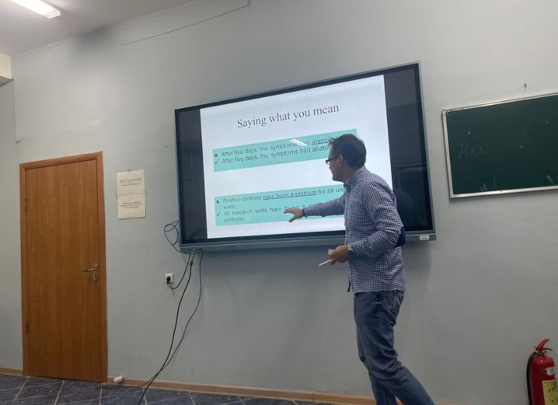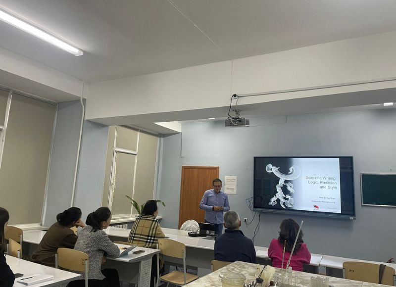 16.09.2024 «Scientific Writing: Logic, Precision and style» тақырыбындағы шеберлік сабақ 2024 жылдың 13 қыркүйегінде Абай атындағы ҚазҰПУ Жаратылыстану және география факультеті биология кафедрасына Германияның Ахен университетінен профессор Илья Дигель іссапармен келді. И.Э.Дигель өзінің жұмыс сапары барысында биология кафедрасының профессор-оқытушылар құрамына «Scientific Writing: Logic, Precision and style» тақырыбында шеберлік сабақ өткізіп, ғылыми мақалалар жазудың қыр-сырымен таныстырды.