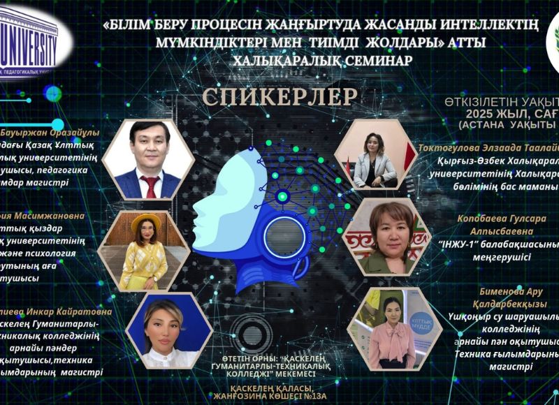 07.04.2025 «Білім беру процесін жаңғыртуда жасанды интеллекттің мүмкіндіктері мен тиімді жолдары» атты халықаралық семинар 2025 жылғы 4 сәуірде Қаскелең гуманитарлы-техникалық колледжінде «Білім беру процесін жаңғыртуда жасанды интеллекттің мүмкіндіктері мен тиімді жолдары» атты халықаралық семинар өтті. Семинарға Қазақстан мен шетелдің жетекші педагогтері, зерттеушілер мен инновациялық жобалар өкілдері қатысты. Іс-шара аясында қатысушылар білім беру саласындағы заманауи трендтер мен тәсілдер бойынша тәжірибе алмасып, жасанды интеллекттің оқу процесіне ықпалына қатысты өзекті мәселелерді талқылады.