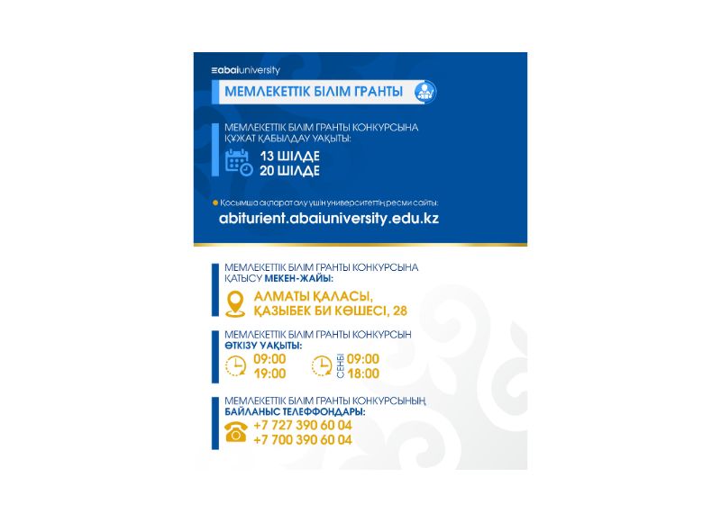 - 2025 жылы 13 - 20 шілде мемлекеттік білім гранты конкурсына құжат қабылдау;