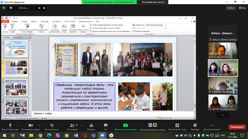 Кездесу спикерлері В.М.Шукшин атындағы Алтай мемлекеттік әлеуметтік-педагогикалық университеті педагогтері мен г.Бийск қаласы бастауыш мектептерінің мұғалімдері болды. іс-шараға қатысушылар төмендегі тақырыптарда ой бөлісті: 1. М.В.Шилова (МКМ «Бийск қаласы Әкімшілігі білім беру Басқармасы») - «Қаланың білім беру жүйесіндегі дарынды бала». 2. Н.Н.Федянина («№1 Гимназия» бастауыш сынып мұғалімі, бастауыш білім беру кафедрасының меңгерушісі) - «Бастауыш білім беру кафедрасындағы дарынды балалармен жұмыс жасау мәселелері». 3. А.Ю.Нижегородцева (Бийск қаласы «№1 Гимназия» бастауыш сынып мұғалімі) - «Дарынды балалармен жұмыстағы тәрбиелеу компоненті». 4. Н.В.Волкова (педагогика ғылымдарының кандидаты, В.М.Шукшин атындағы АМӘПУ, педагогика және психология кафедрасының доценті) - «Бастауыш мектептегі жобалау әрекеті - дарынды балалар үшін білім беру ортасы». 5. И.Н.Чичканова (педагогика ғылымдарының кандидаты, В.М.Шукшин атындағы АМӘПУ, психологиялық-педагогикалық, мектепке дейінгі және бастауыш білім беру кафедрасының доценті) - «Зерттеушілік әрекеттегі кіші мектеп жасындағы оқушылардың танымдық қызығушылықтарын дамыту векторлары».
