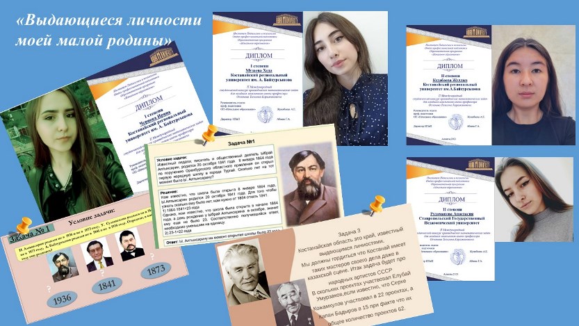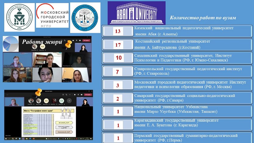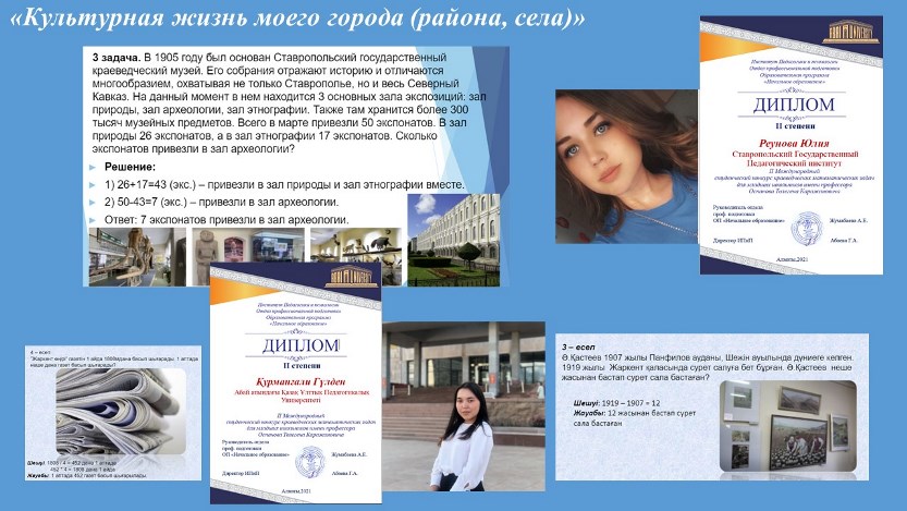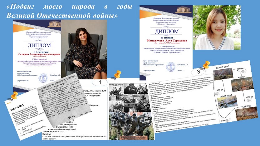 Педагогика және психология институты Бастауыш білім беру бағдарламалары кәсіби даярлау бөлімі профессор Төлеген Қаражанұлы Оспанов атындағы кіші мектеп жасындағы оқушыларға арналған өлкетану математикалық есептері бойынша студенттердің ІІ Халықаралық байқауын ұйымдастырды. Байқау қашықтан өткізілді. Ол 2021 жылы 15 қазан күні жарияланып, байқау жұмыстары 2021 жылдың 15 қарашасында жинақталды. 25 қарашада байқаудың қорытындысы шығарылып, нәтижесі хабарланды. Байқау жүлдегерлеріне дипломдар жіберілді.