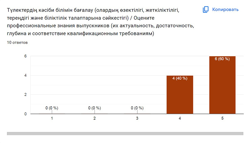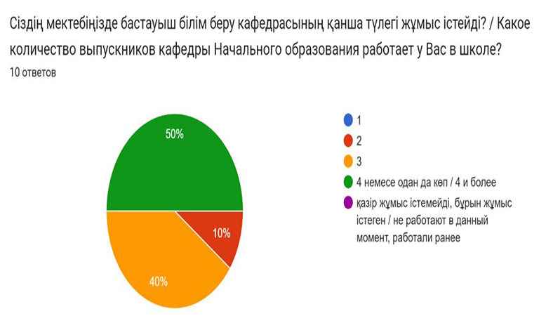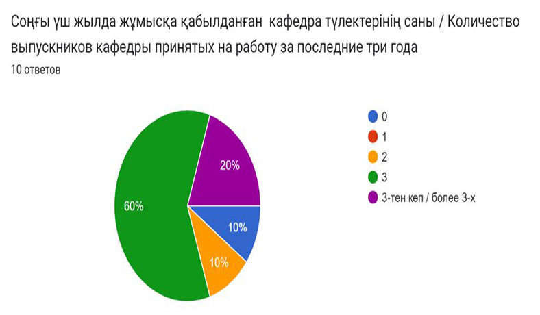 Сауалнама жүргізілген мектептерде кафедраның 2 немесе одан да көп түлек жұмыс істейді. Жұмыс берушілер жас мамандардың теориялық білімі мен практикалық дайындығының жоғары деңгейін атап өтті, жоғары еңбек тәртібін және өздігінен білім жетілдіруге деген ұмтылыстарын ерекшеледі. Жаңа жағдайларға бейімделгіштігі мен еңбек міндеттерін өз бетінше орындау қабілеті де жоғары бағаланды. Сондай-ақ, студенттердің тілді меңгеру, ақпараттық технологиялар, экономикалық сауаттылық жағынан қосымша дайындық деңгейін арттыру керектігі де атап өтілді.