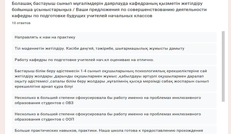 Маман даярлауды жақсарту бойынша ұсыныстары төмендегідей болды: болашақ мұғалімдердің тіл мәдениетін арттыру; дарынды және ерекше білім беру қажеттіліктері бар балалармен жұмыс істеуге дайындау, инклюзивті білім беруге көңіл бөлу; оқушылардың функционалдық сауаттылығын дамыту әдістемесін оқып үйрену.