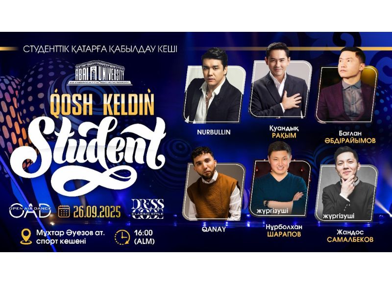 «Қош келдің, студент!» мерекелік қабылдау кеші өтеді 26 қыркүйек күні Мұхтар Әуезов атындағы спорт кешенінде Абай университетінің бірінші курс студенттері үшін «Қош келдің, студент!» атты мерекелік қабылдау кеші өтеді.