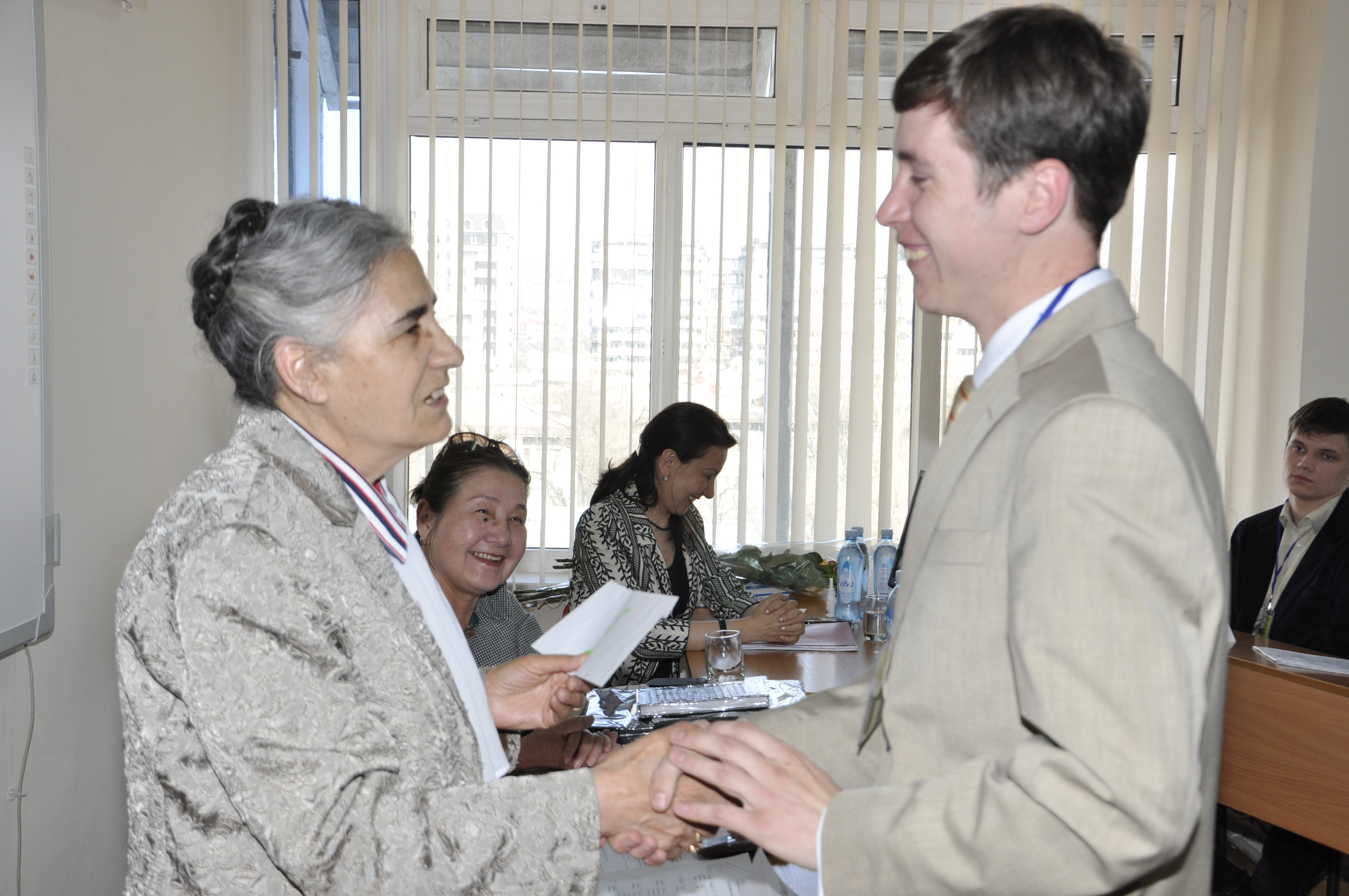 В состав жюри вошли: 1. Асылы Осман - член Ассамблеи народов Казахстана 2. Касым Балкия - д.и.н., зав. кафедрой Государственного языка КазНПУ им. Абая., профессор 3. Жумагулов Б.С. - Начальник учебного управления КазНПУ им. Абая Единогласным решением компетентного жюри, победителем конкурса признан студент 3 курса специальности 050114 - История Малышев Виктор. Молодой человек считает, что знать язык страны, в которой ты живешь, долг каждого гражданина вне зависимости от национальности. Победителям интеллектуальной олимпиады вручены денежные призы: 1 место - 15 тысяч тенге 2 место - 10 тысяч тенге 3 место - 5 тысяч тенге
