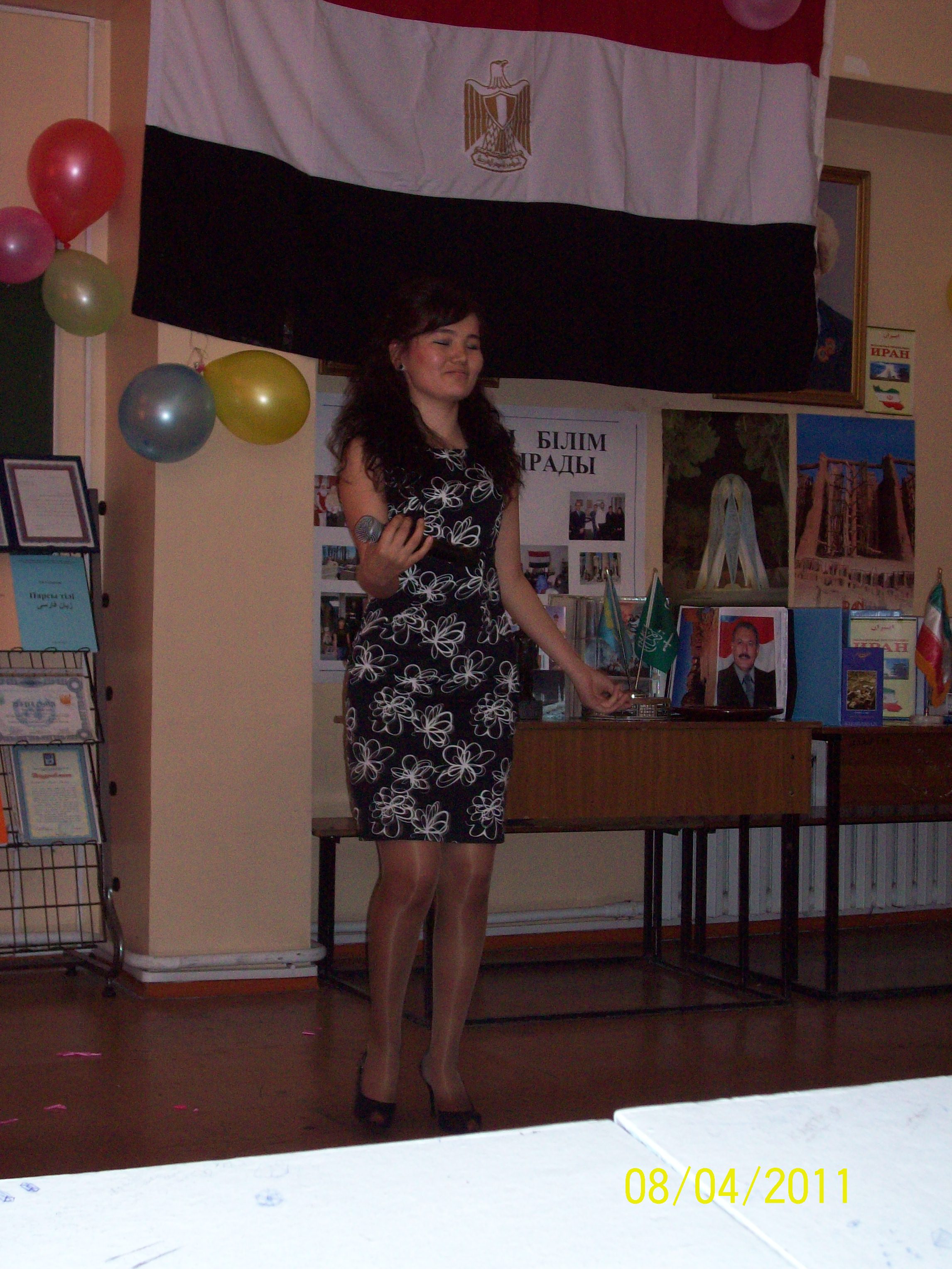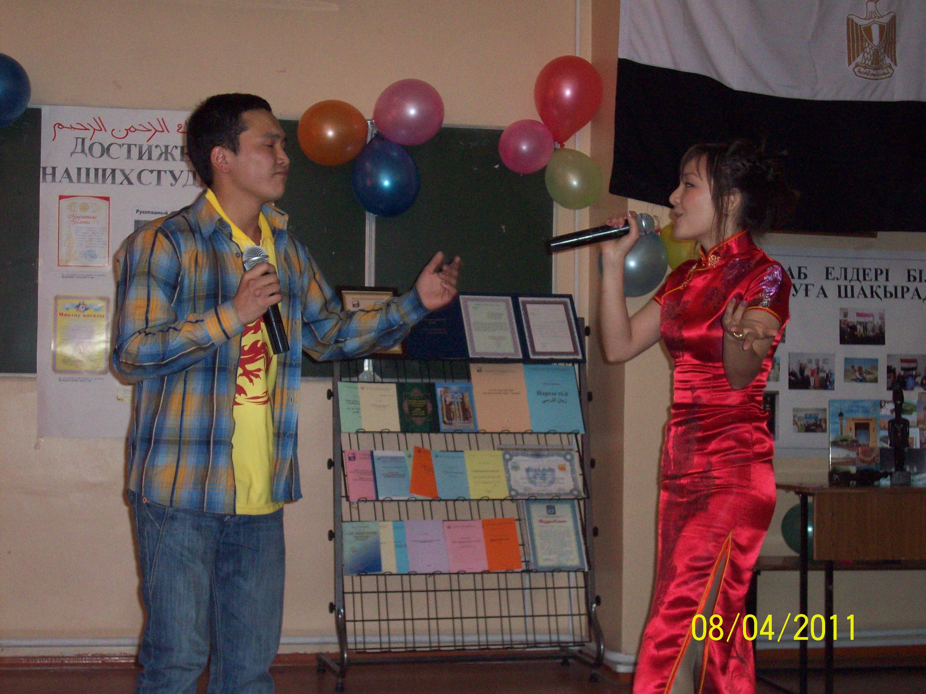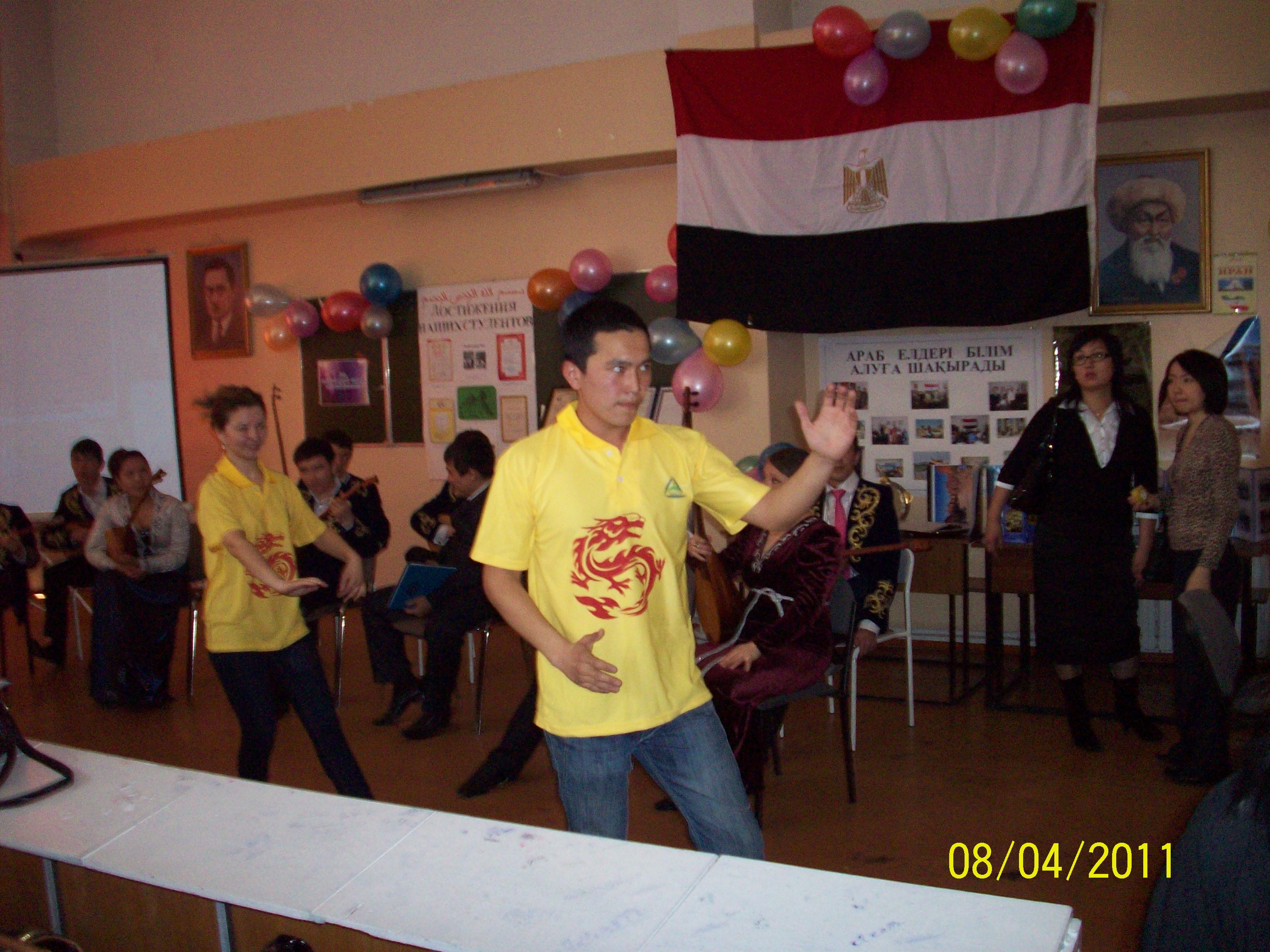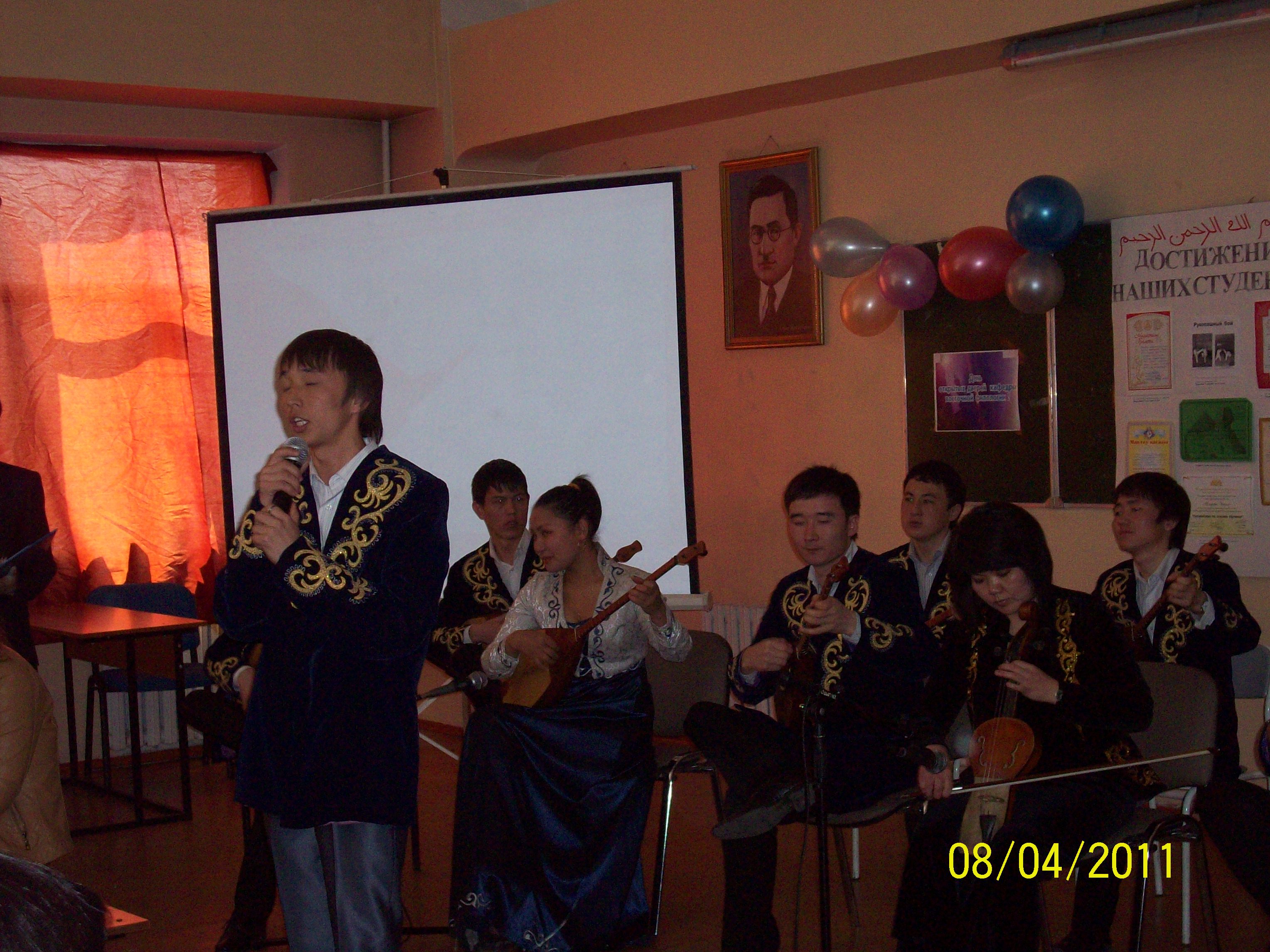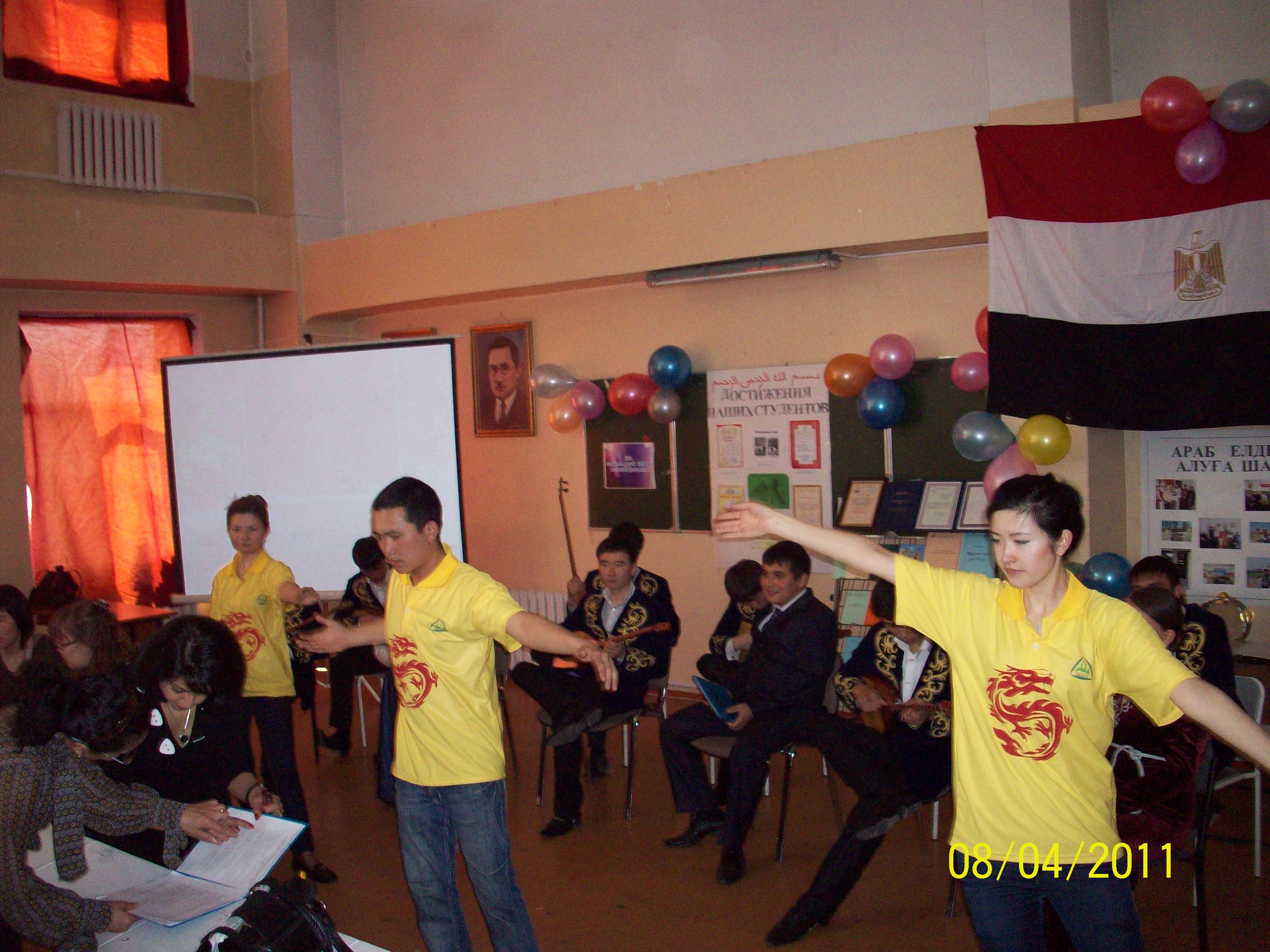 08.04.2011 День восточной филологии. 8 апреля в КазНПУ им.Абая прошёл день открытых дверей кафедры восточной филологии. Кафедра обеспечивает преподавание следующих восточных языков: турецкий, арабский, персидский, китайский, корейский и японский. На филологическом факультете данные языки изучаются в качестве основного. Главные направления научно-исследовательской работы кафедры - история современных восточных языков, стилистика, диалектология, культура речи, методика обучения восточным языкам. На кафедре восточной филологии сложились устойчивые традиции, направленные на поддержание высоких стандартов в области образования и научных исследований, сохранения надлежащего уровня преподавания и соблюдения профессиональной этики, достижения гибкости и последовательности учебных программ. Именно для ознакомления с восточной кафедрой и привлечения абитуриентов, был проведён день открытых дверей. Организатором мероприятия выступила кандидат педагогических наук, доцент Тагиева Н. А. Она проводила отбор талантов среди студентов ВУЗа, готовила сценарий, вместе с учениками придумывала видеосюжеты и викторины. Студенты и преподаватели, словно одна семья - с трепетом ждали этого события. Ведь день открытых дверей - это путь к успеху, как для кафедры восточной филологии, так и для всего университета. И вот день открытых дверей настал. С самого утра, словно пчёлки, все трудились в главном зале ВУЗа. Кто-то надувал шары и украшал аудиторию плакатами и флагами восточных стран, а кто-то повторял слова для выступления и настраивал народные инструменты. К началу праздника зал был полон, приглашённые абитуриенты из 5 школ с интересом поглядывали на активных студентов. Расспрашивали об университете, об учёбе, просили рассказать что-нибудь на языках, которые студенты учат. «Я тоже хочу учить китайский»- с искоркой в глазах сказала одна из школьниц. Быть может, именно день открытых дверей, поможет школьникам определиться с выбором, как профессии, так и университета. Представление - а точнее праздник, именно так хотелось назвать день открытых дверей, потому что атмосфера радости сохранялась на протяжении всех выступлений. Участниками праздника были как студенты, так и преподаватели. Согласно программе, в первую очередь был представлен видеоролик о деятельности КазНПУ им. Абая, где рассказывалась история университета, его заслуги и достижения студентов. Представлен перечень специальностей, анализ работы общеуниверситетских кафедр и факультетов. Это помогло пришедшим школьникам ознакомиться, как с восточной кафедрой, так и с деятельностью всего университета. Музыкальное сопровождение осуществлял фольклорно-этнографический ансамбль университета, под руководством Матбуса Ж.Б. и Бектенбетовой К.А. Студенты всех языковых отделений представили номера на профильных языках, пели песни и танцевали танцы «своих» народов. Отделение китайского языка помимо песен организовали викторину «Китай - Восток - дело тонкое», тем самым проверив, насколько нынешние школьники знакомы с культурой современного Китая. А студенты арабского языка, в свою очередь представили юмористический скетч «Смерть денег», рассмешив публику и окончательно расположив её к себе. В заключении концерта, состоялась фотосессия в праздничных, народных костюмах. День восточной 