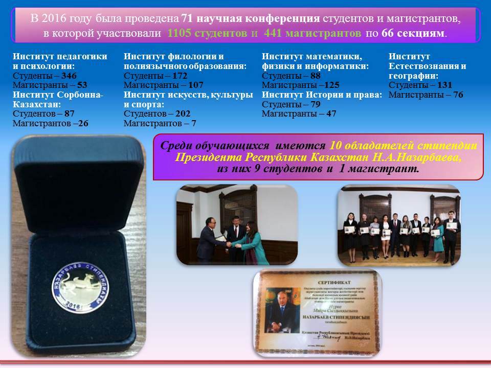 Университет ежегодно направляет в вузы-партнеры на научную стажировку магистрантов и докторантов. В 2016 г. 595 магистранта и 23 докторантов прошли научную стажировку в университетах Испании, Польши, Германии, Австрии, Венгрии, США, Франции, Литвы, Латвии, КНР, Южной Кореи, Турции, Чехии, Словении, Индии, Болгарии, России, Белоруссии, Украины, Кыргызстана. В 2016 году для чтений лекций и проведение мастер-классов посетили 71 ведущих ученых из дальнего и ближнего зарубежья, в частности из Испании, Польши, Германии, Австрии, США, Франции, Италии, Литвы, Эстонии, Австралии, Египта, Японии, Вьетнама, КНР, Южной Кореи, Турции, Болгарии, России, Белоруссии, Украины, Узбекистана.