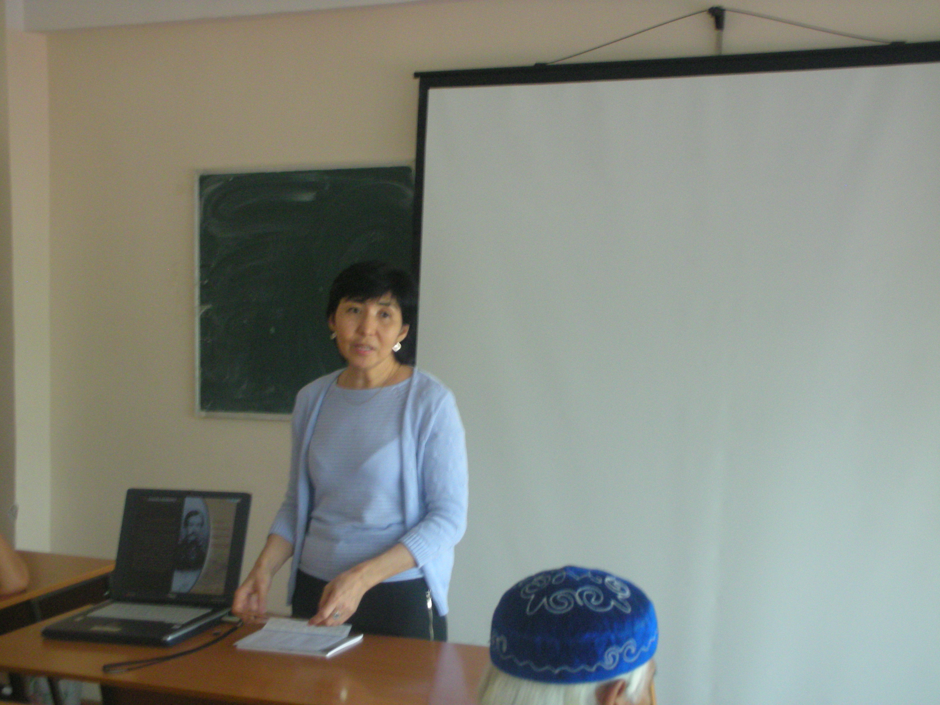 18.05.2011 На историческом факультете 17 мая 2011 г. состоялась встреча с арт-директором негосударственной организации «Диалог культур» ( г. Санкт-Петербург, Российская Федерация) Макбал Шахановной Мусиной. Она представила очень интересный материал по проекту «Чокан Валиханов в Санкт-Петербурге», в частности ею были продемонстрированы ранее неопубликованные, редкие сведения о Чокане Валиханове в период его пребывания в Санкт-Петербурге. Макбал Шахановна подробно рассказала о важнейших страницах его служебной и научной деятельности в столице, круге общения, адресах, связанных с именем Чокана Валиханова.