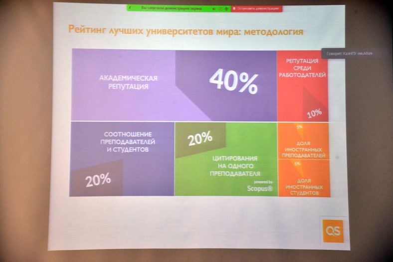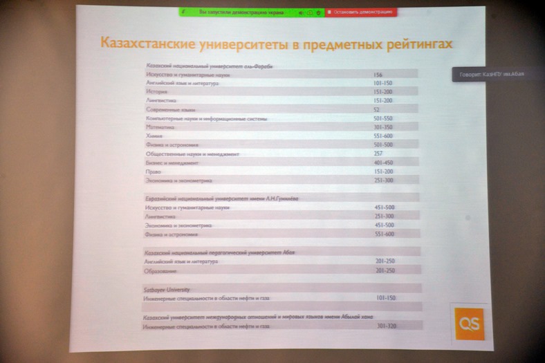 Өз кезегінде Сергей Христолюбов соңғы 10 жылда QS WUR жаһандық рейтингісінде ұсынылған қазақстандық жоғары оқу орындарының саны 5-тен 10-ға дейін артқанын атап өтті, сондай-ақ қазақстандық жоғары оқу орындарының әлемдік институционалдық рейтинг аясындағы ілгерілеуі мен белсенділігінің оң серпініне назар аударды. Кездесуге қатысушылар QS World University Rankings by Subject-2021 рейтингінде қазақстандық жоғары оқу орындарының үздік нәтижелерін талқылады. ҚР жоғары оқу орындарының жаһандық және пәндік рейтингтегі көрсеткіштері ұсынылды, сондай-ақ Қазақстанның жоғары оқу орындарына дауыс берген жетекші елдер (Ресей, АҚШ, Түркия, Өзбекстан және Қырғызстан) келтірілген академиялық бедел тұрғысынан талдау жасалды.