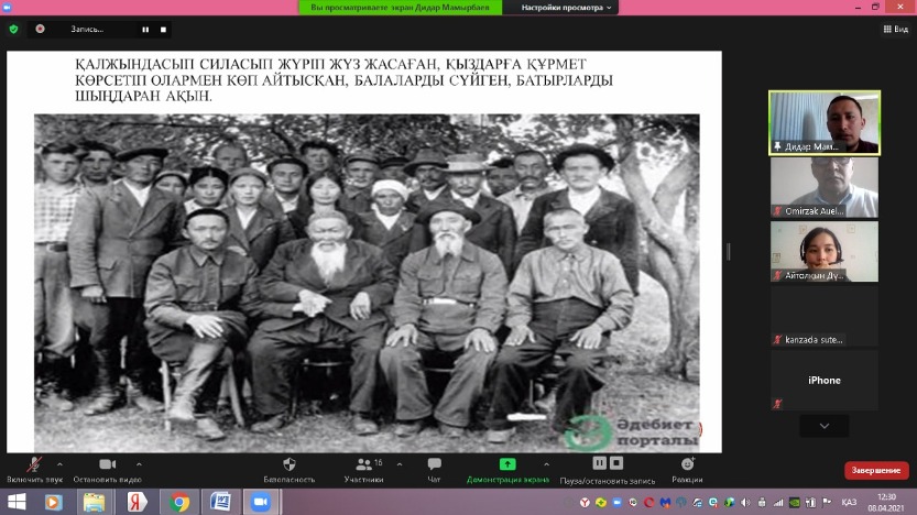 Кафедраның жас оқытушылары Қасымов Мадияр және Мамырбаев Дидар жастарға арғалған «Жамбыл өнегесі» тақырыбында әңгіме өрбітті. Шараға «Тарих-дінтану» мамандығының 3 курс студенттері белсене қатысып, ақынның жыр-дастандарынан үзінді оқыды. Сұрақтар қойылып, ұтымды жауаптар алынды. Шара жоғары деңгейде өтті.