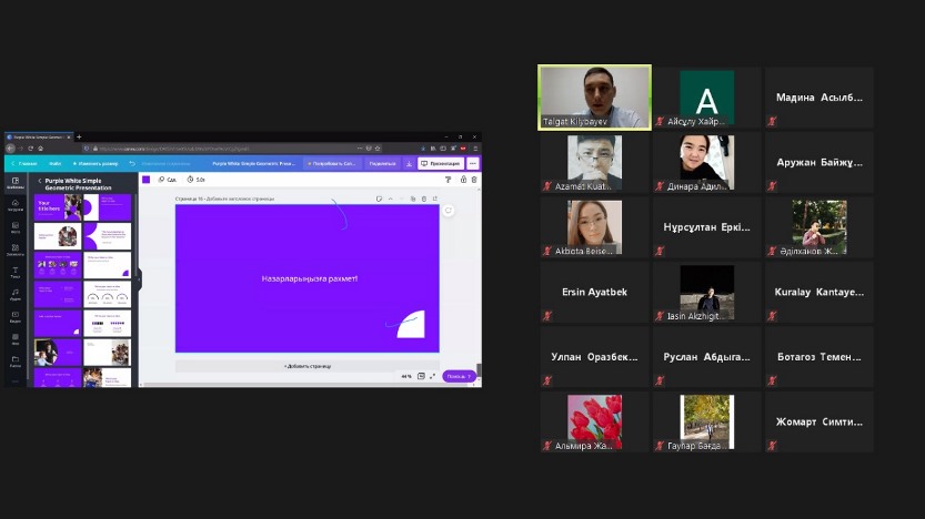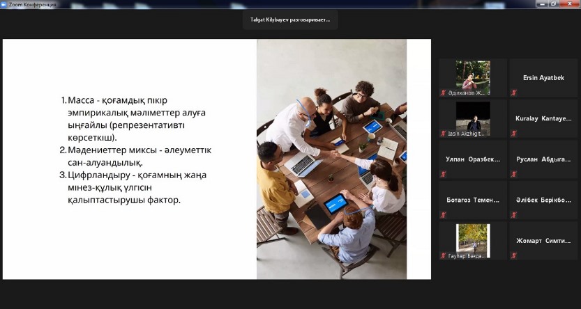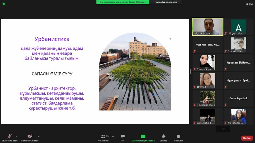 14 апреля 2021 года в рамках плана Месяца науки-2021 пост-докторант кафедры политологии и социально-философских дисциплин Института истории и права Талгат Килыбаев провел вебинар «Урбанизация: город как объект исследования».