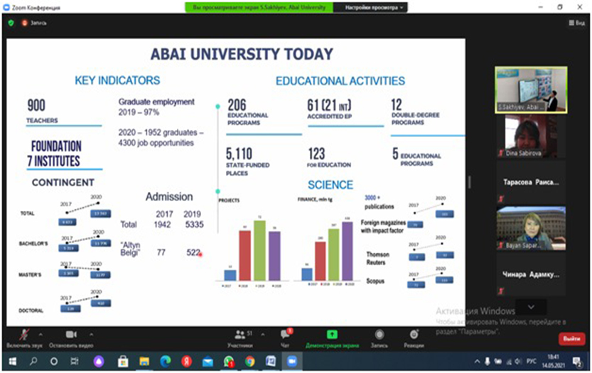 14.05.2021 года постдокторанты КазНПУ имени Абая и рабочая группа проекта KAZDUAL во главе с проректором по Цифровизации и науке и руководителем проектной команды КазНПУ Сахиевым С.К. приняли участие на Международном вебинаре, организованном совместно с участием Софийского университета им. Св. Климента Охридского - Научно-образовательного и культурного центра им. Аль-Фараби, КазНУ имени Аль-Фараби и КазНПУ имени Абая, в рамках серии Международных вебинаров проекта «Цифровизация и образование в условиях пандемии Ковид-19: практики и инновации в высшем образовании в Болгарии и Центральной Азии (Казахстан, Узбекистан, Кыргызстан, Таджикистан) и Иран».