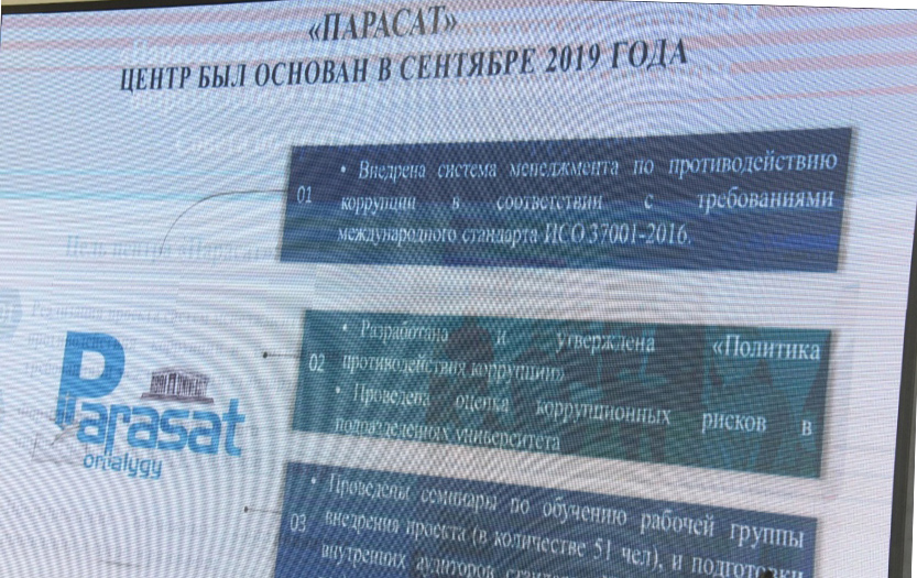 В своем выступлении Д.Н.Билялов сообщил, что меры по противодействию коррупции в КазНПУ имени Абая и соблюдению принципов академической честности осуществляются в соответствии с указаниями МОН РК на основании плана, утвержденного офисом «Саналы Урпак» Департамента по противодействию коррупции г. Алматы. В университете действует антикоррупционный совет. В 2019 году по предложению проектного офиса «Саналы Урпак» Агентства РК по противодействию коррупции в университете создан центр «Парасат» с целью предотвращения возможной коррупции, формирования антикоррупционной культуры студентов. По инициативе центра внедрена система антикоррупционного менеджмента международного стандарта ИСО 37001-2016.
