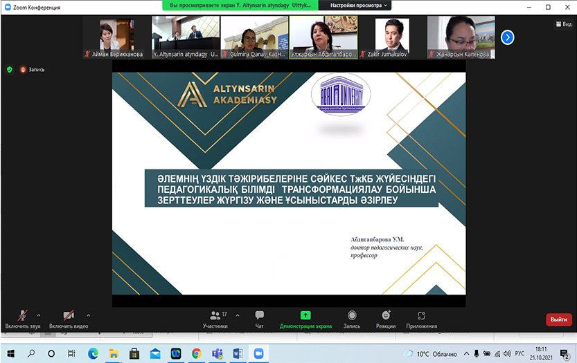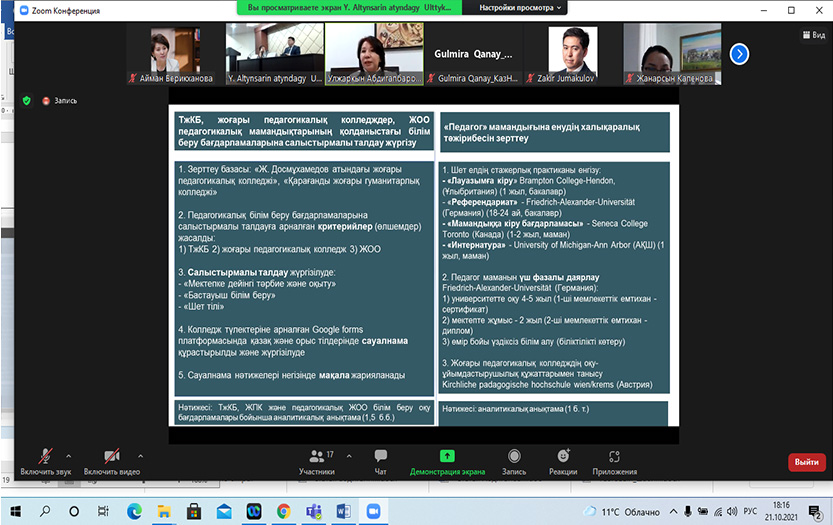 21 октября 2021 года в НАО им. Алтынсарина состоялась встреча всех проектных команд для представления промежуточных отчетов и обсуждения результатов исследования. Отчет проектной группы КазНПУ им. Абая был успешно представлен профессором У.М.Абдигапбаровой и получил высокую оценку и одобрение ученых.