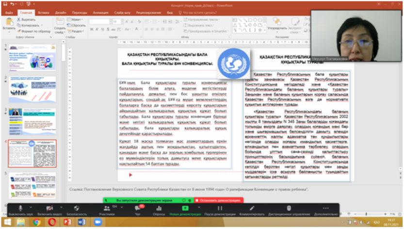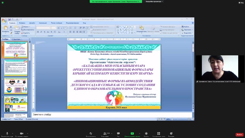 Методист Бурлинского ОО ЗКО «Ясли-сад №1 г. Аксай» Нугманова Самал поделилась опытом работы по взаимодействию с родителями в организациях дошкольного воспитания и обучения по теме «Инновационные формы взаимодействия детского сада и семьи как условие создания единого образовательного пространства».