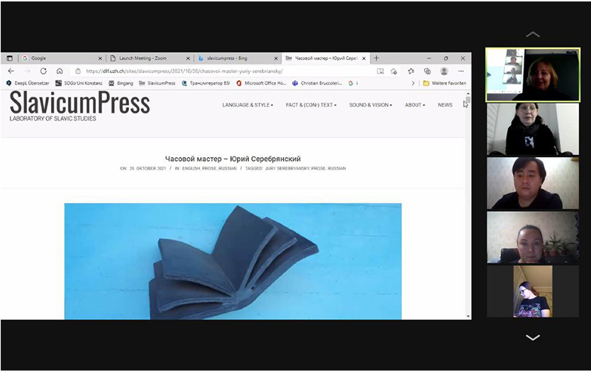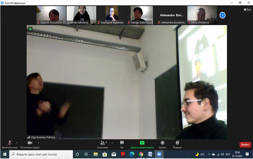Модераторами были научный сотрудник Констанцского и Цюрихского университетов О.Д.Буренина-Петрова и профессор-исследователь КазНПУ им. Абая Л.В.Сафронова, приглашенная в проект Цюрихского университета «Meidalanscapes of Russian Literature: Text Reading» в качестве со-преподавателя. Проект предполагает создание открытого онлайн-курса в рамках MOOK на платформе Цюрихского университета в коллаборации с Университетом Лозанны Швейцарии, Констанцским университетом Германии, Загребским университетом Хорватии, Санкт-Петербургским государственным университетом России и КазНПУ им. Абая.