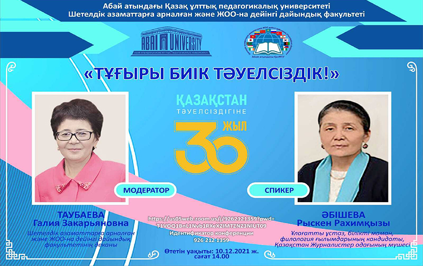 10 декабря 2021 года среди слушателей отделения довузовской подготовки факультета для иностранных граждан и довузовской подготовки состоялся круглый стол в онлайн-формате, посвященный 30-летию Независимости РК. Тема - «Тұғыры биік Тәуелсіздік!».