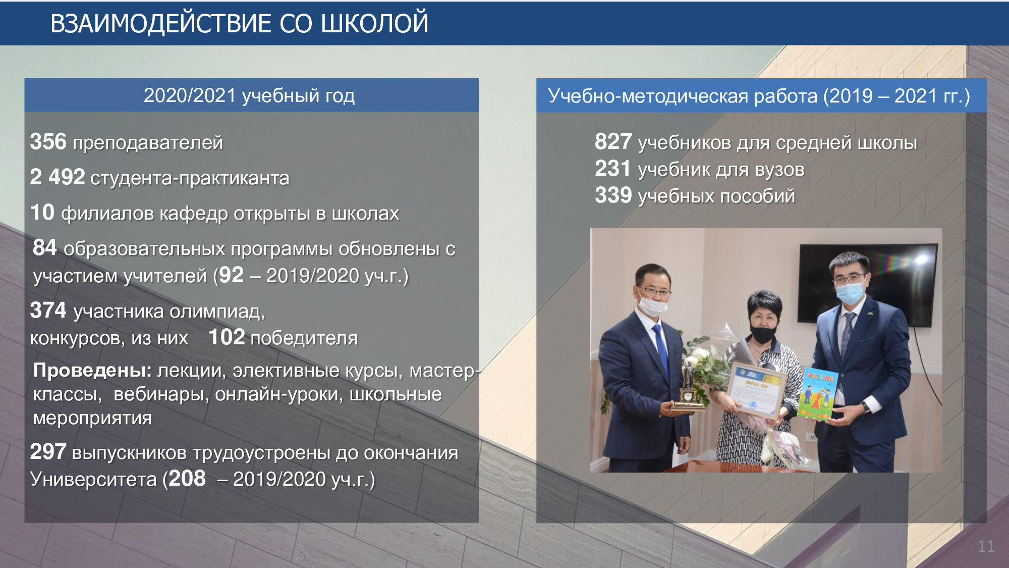 Число ППС и сотрудников, выезжавших в зарубежные командировки (участие в семинарах, форумах и др.) в 2021-2022 учебном году, составило 27 человек, из них: чтение лекций - 2, научные стажировки - 5, участие в конференциях, симпозиумах и научных проектах - 20. В 2021-2022 учебном году 14 преподавателей университета прошли стажировку по программе «Болашак».