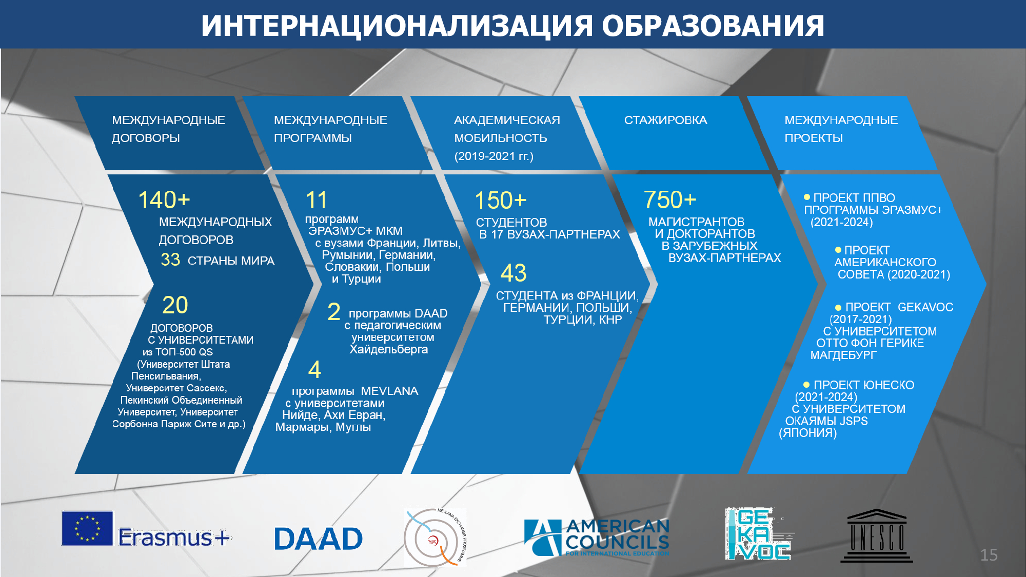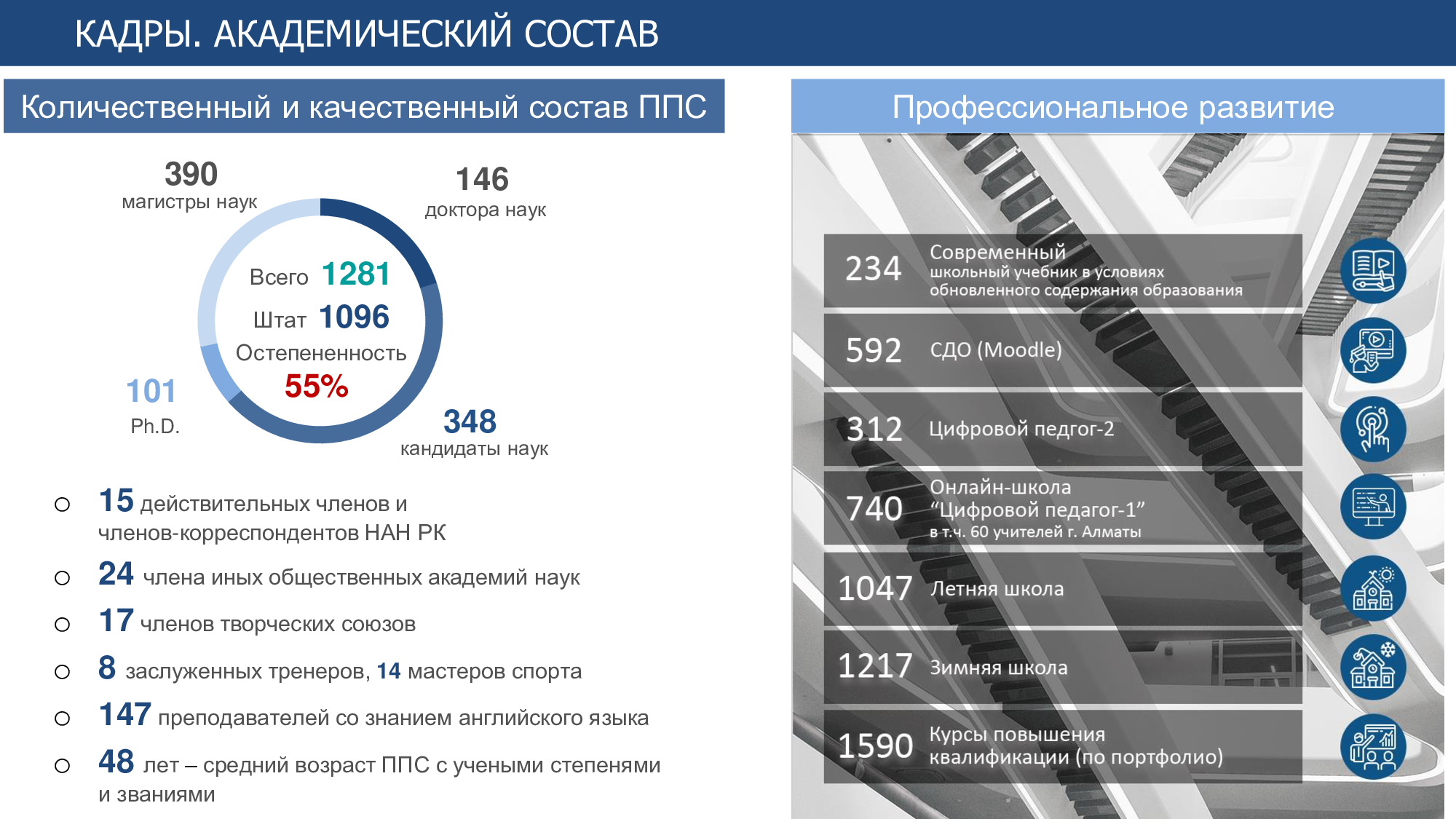 Мотивацией для ППС и сотрудников университета являются результаты конкурсов и получение стипендий в различных международных организациях образования. Мобильность ППС и персонала университета реализуется за счет краткосрочных семинаров, образовательных модулей, международных программ «Tempus», Erasmus+, гранта «Лучший преподаватель» и т.д.
