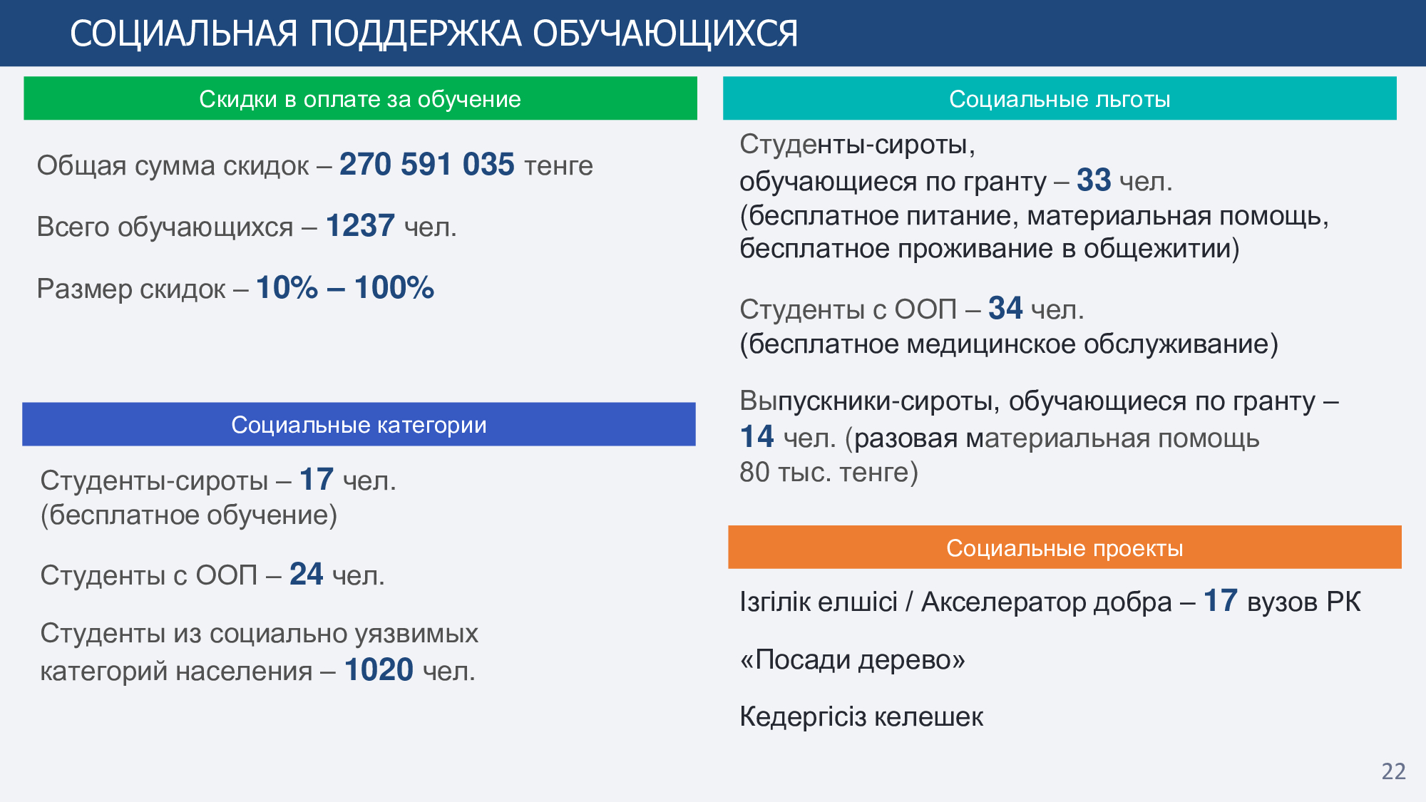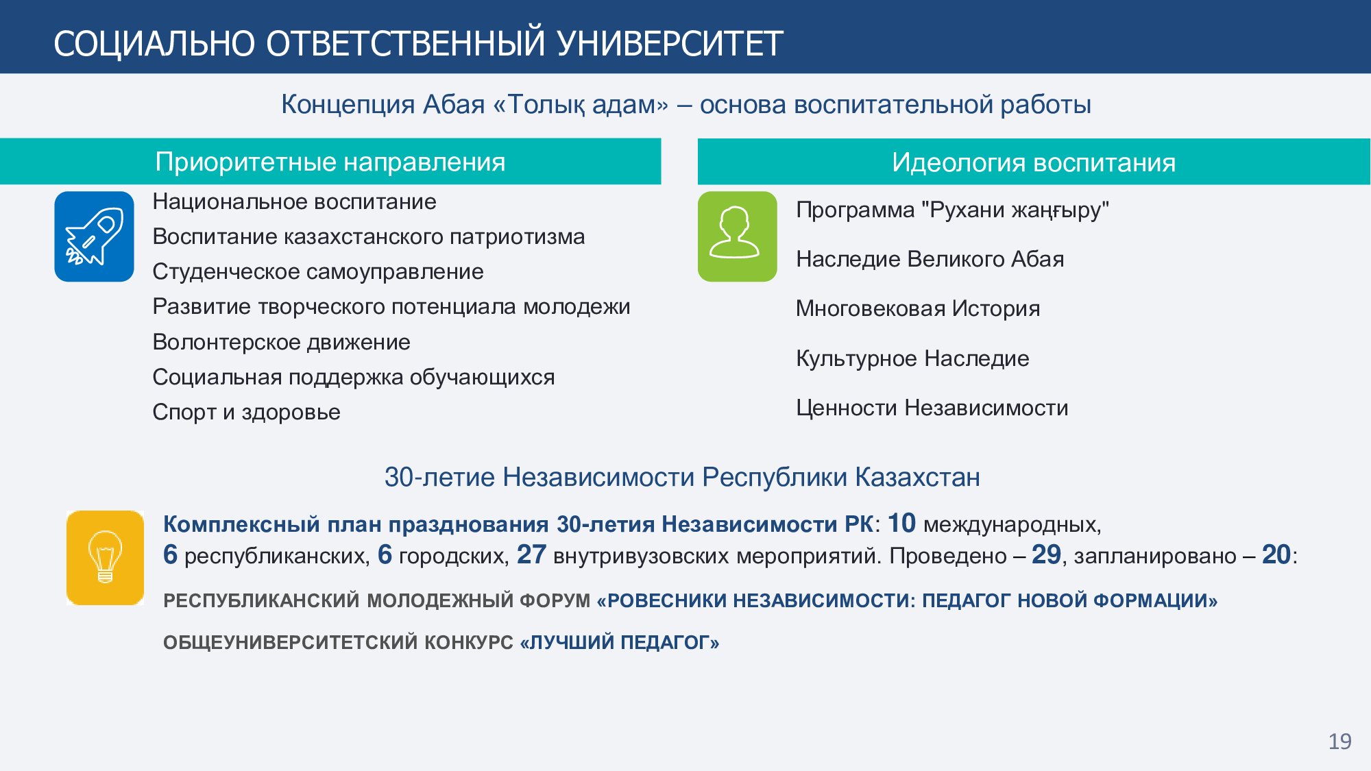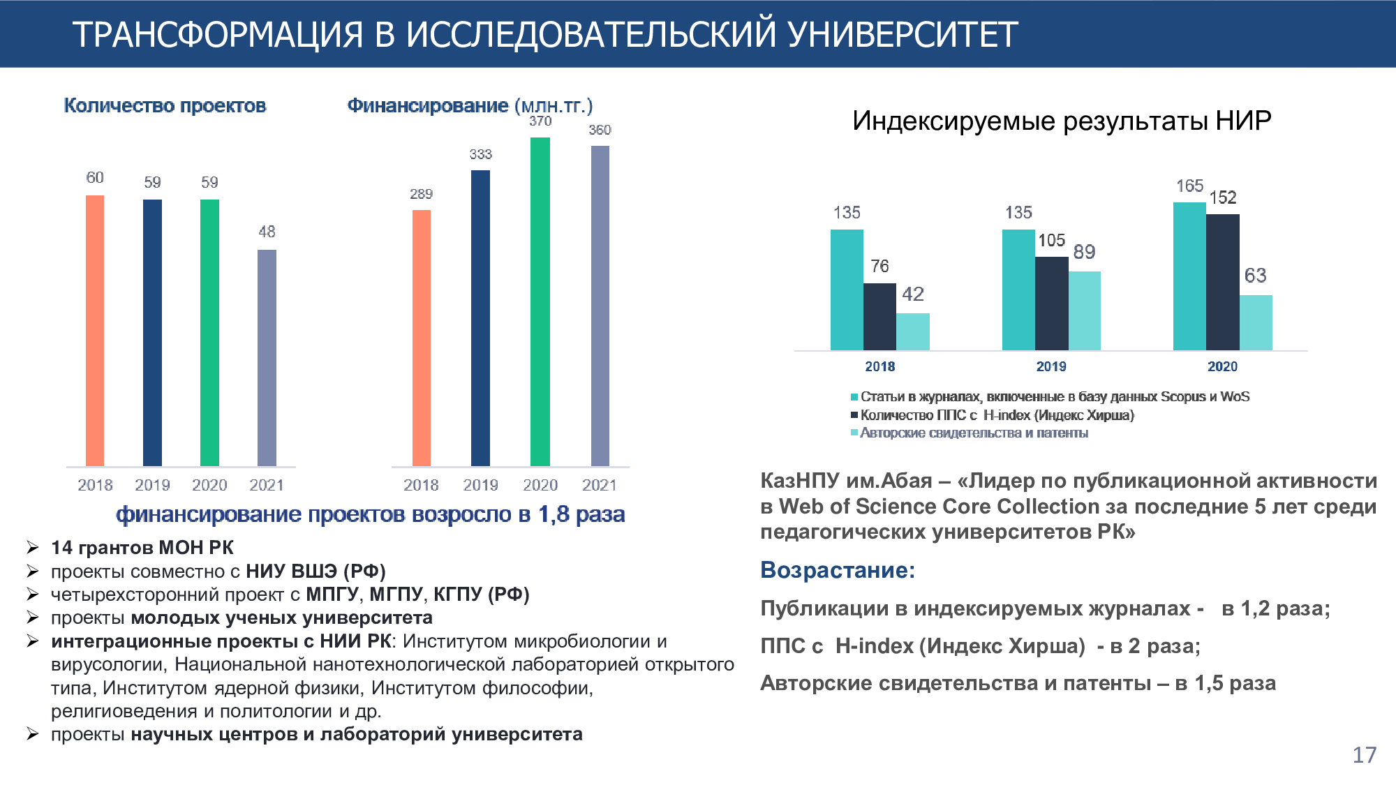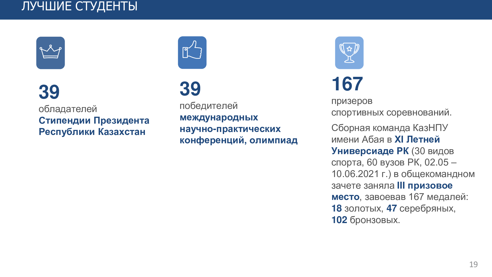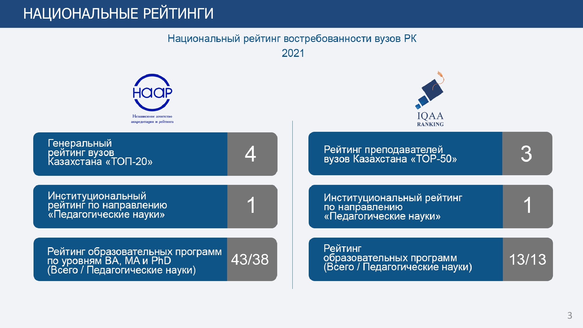 В генеральном рейтинге ТОП-20 вузов Казахстана, проведенном Независимым агентством аккредитации и рейтинга, за 2023 год наш университет занимает почетное 4-е место, а среди педагогических вузов 1-е место. В рейтинге вузов РК по группам образовательных программ завоевал 54 призовых места, в том числе: 1 место - 34 ОП, 2 место - 19 ОП и 3 место - 1 ОП. В ТОП-50 ППС РК входит 6 преподавателей университета: Бурибаев Е.А., Хамзина Ж.А., Бердышев А.С., Косов В.Н., Жармаганбетова А.К. и Тілеуберді Е.